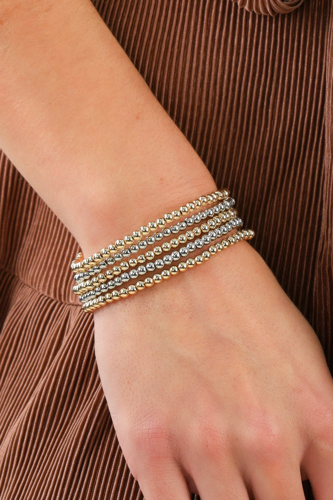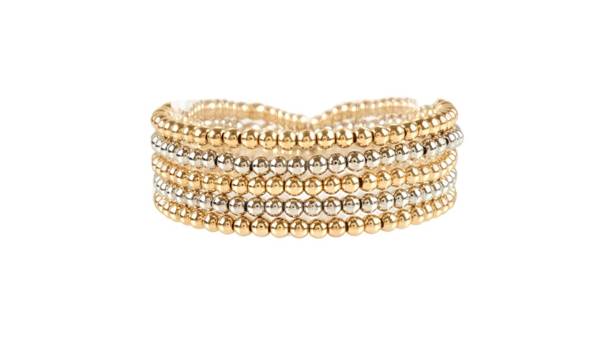 Adorn yourself in subtle luxury with our Gold and Silver Mini Beaded Set of 5 Stretch Bracelets! This chic ensemble features a mix of delicate gold and silver beads, effortlessly adding a touch of sophistication to your wrist. Versatile and easy to stack, these bracelets are the perfect finishing touch for both casual and dressy occasions, ensuring you shine with elegance.
