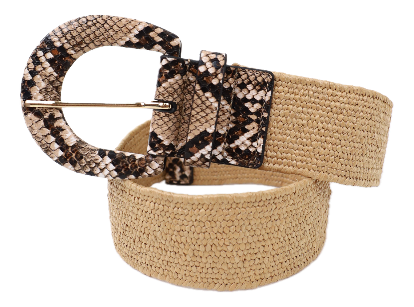 Jazz up your summer style with our Stretchy Woven Raffia Belt, featuring chic snakeskin details! Perfect for adding elegance to any outfit. Pair it with shorts and a white top for a fresh daytime look or drape it over a dress to cinch your waist for sophisticated style. Finish the chic look with tan wedges – your complete summer fashion statement!