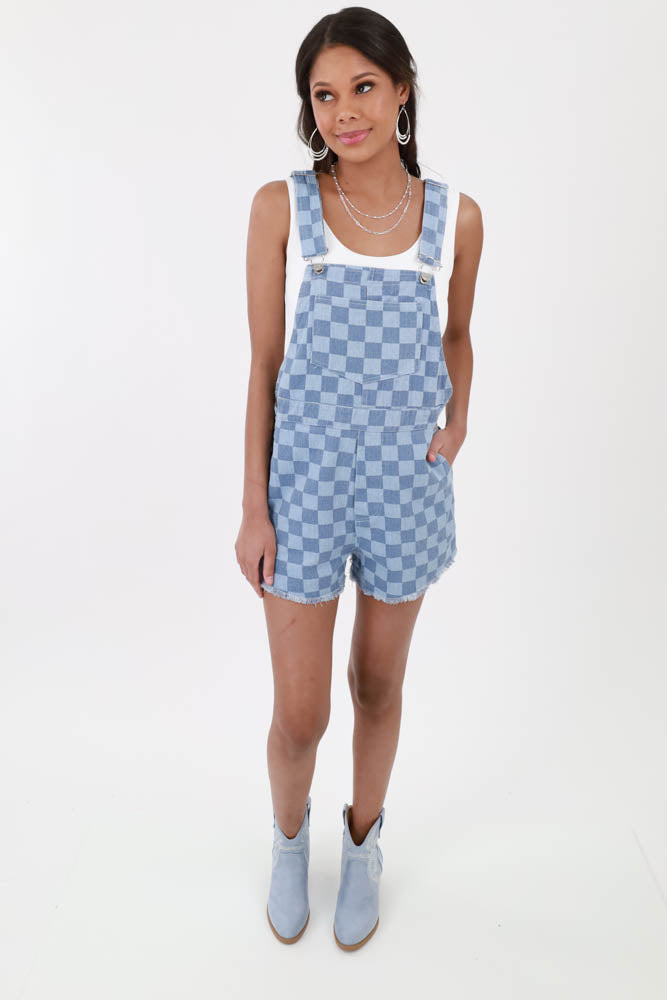Upgrade your casual, all-season wardrobe with these versatile denim overalls, featuring a trendy square neck, raw hem, and checkered pattern, perfect for effortless style at concerts and festivals.