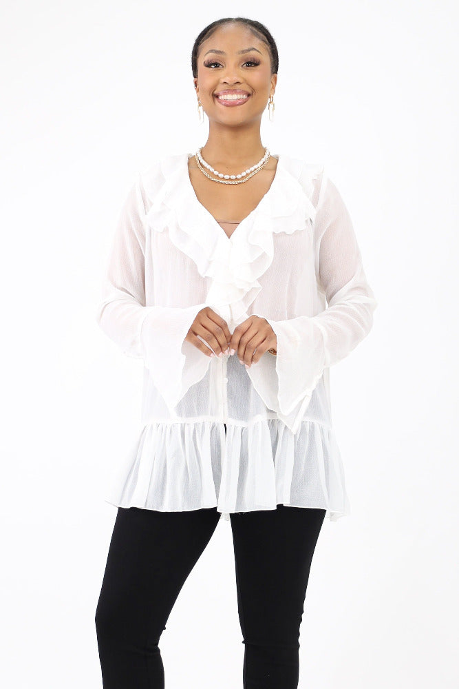 Introducing our Ruffled Button Tunic Top, a chic blend of style and comfort. Featuring feminine ruffles and a classic button-up design, this top adds flair to any outfit. Versatile for both casual and formal occasions, it's a must-have for your wardrobe. Shop now and elevate your look with effortless sophistication!