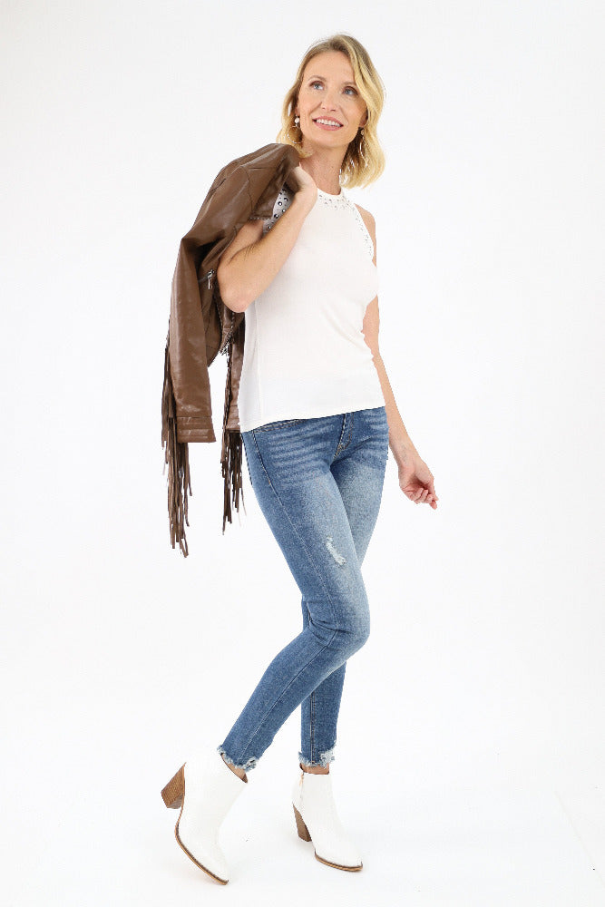 Stylish Studs Embellished Tank Top -Ivory