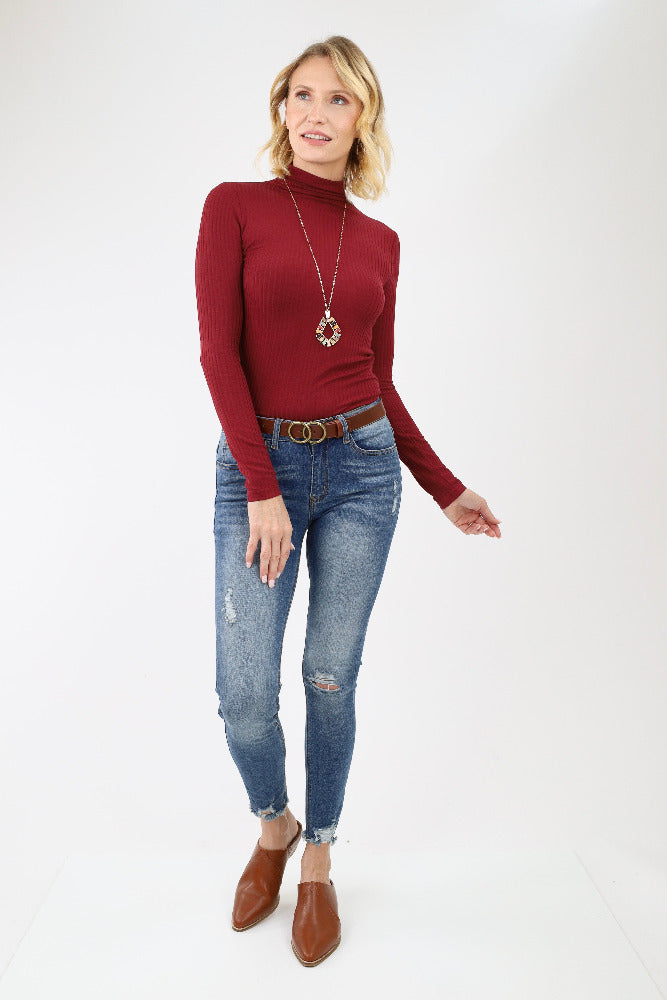 Ribbed Mock Neck Top - Burgundy