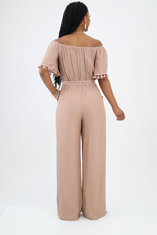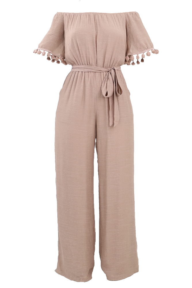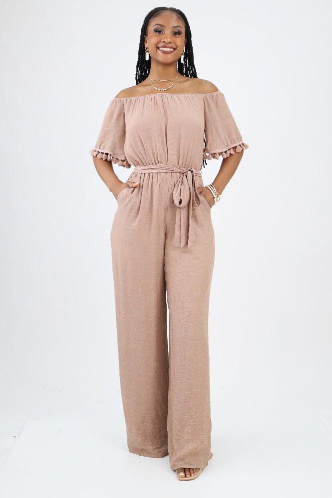 Off Shoulder Woven Jumpsuit With Tassel Detail