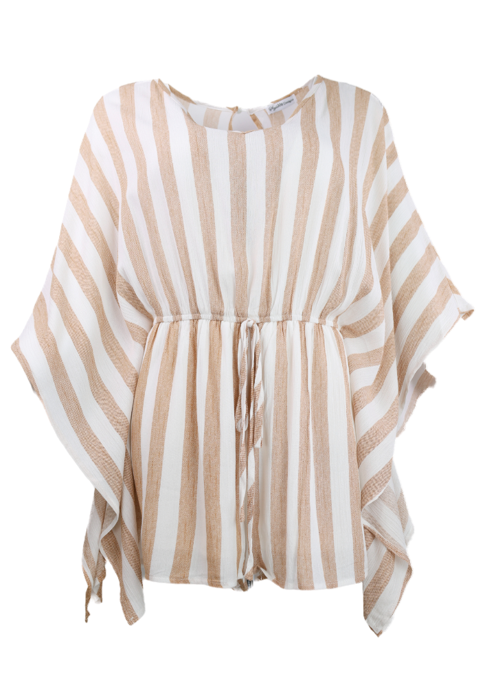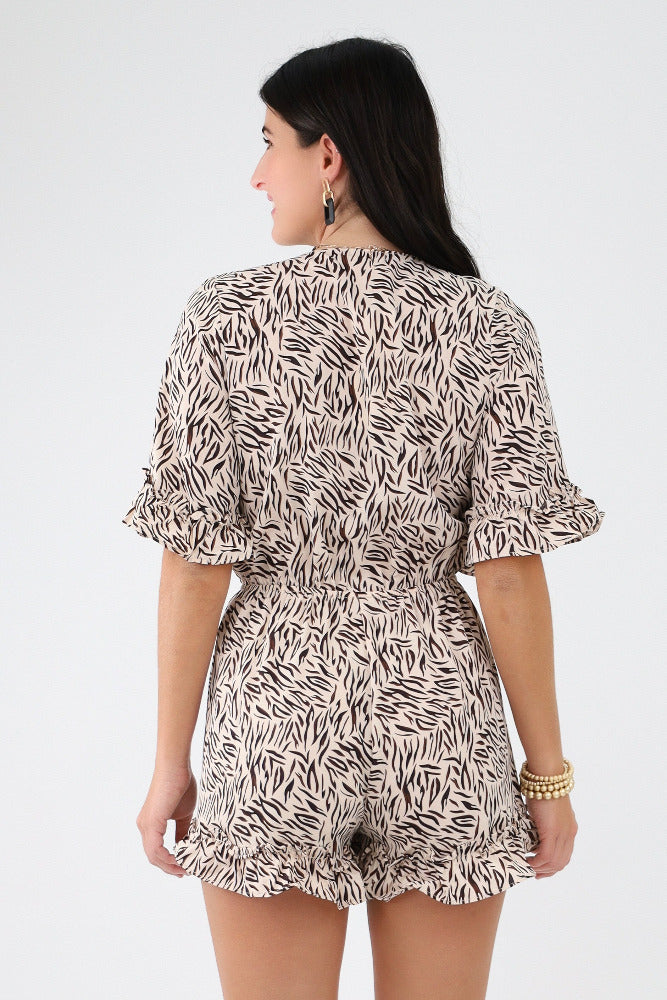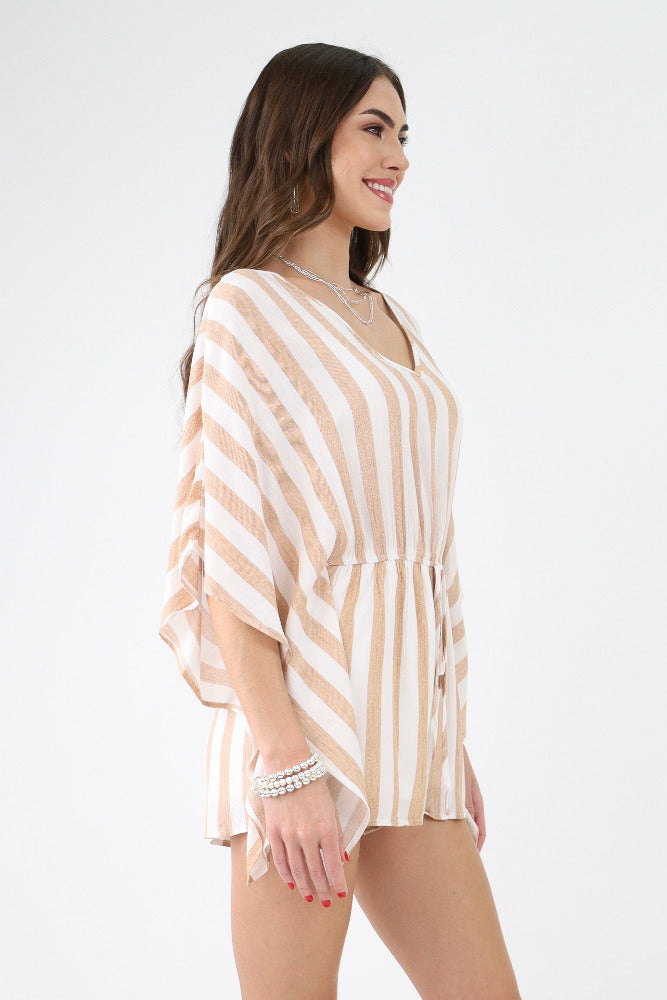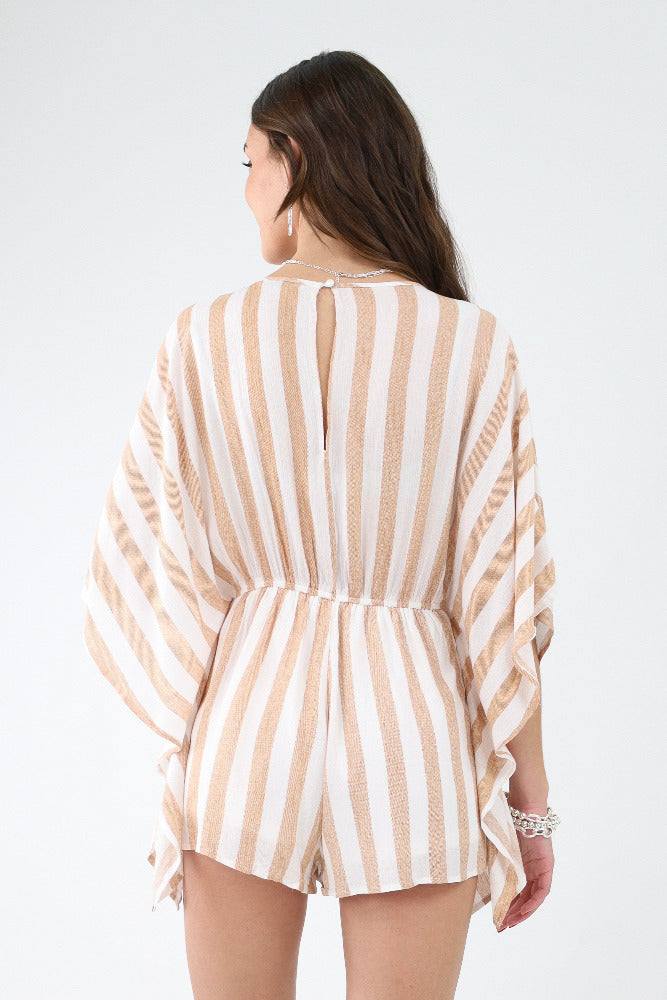 Striped Woven V Neck Romper - Mocha