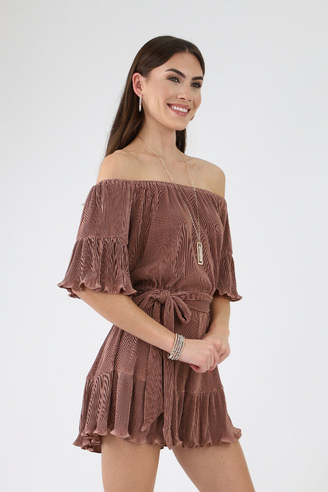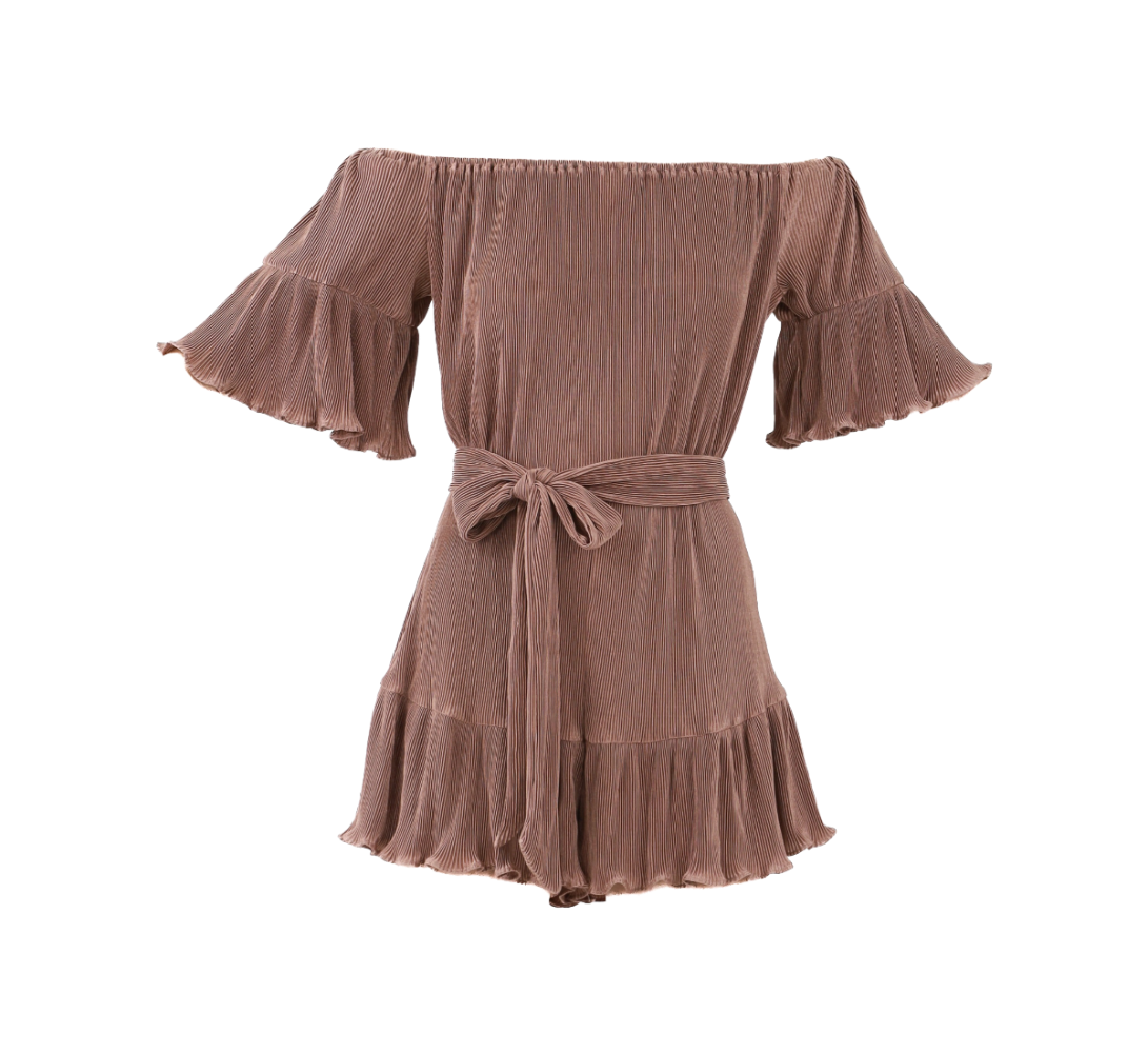 Pleated Off Shoulder Romper - Brown