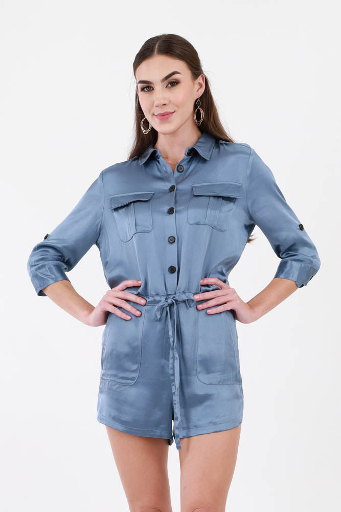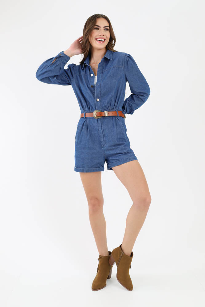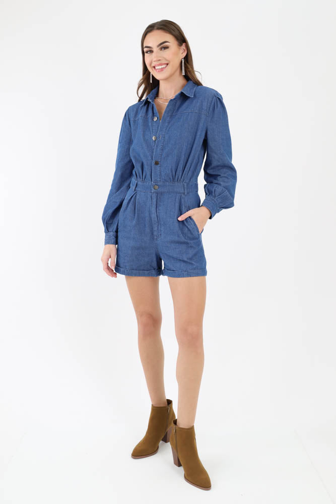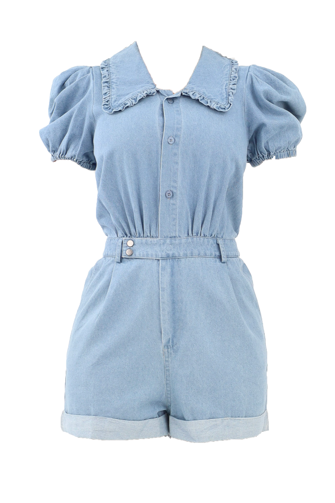 Button Denim Romper - Blue
