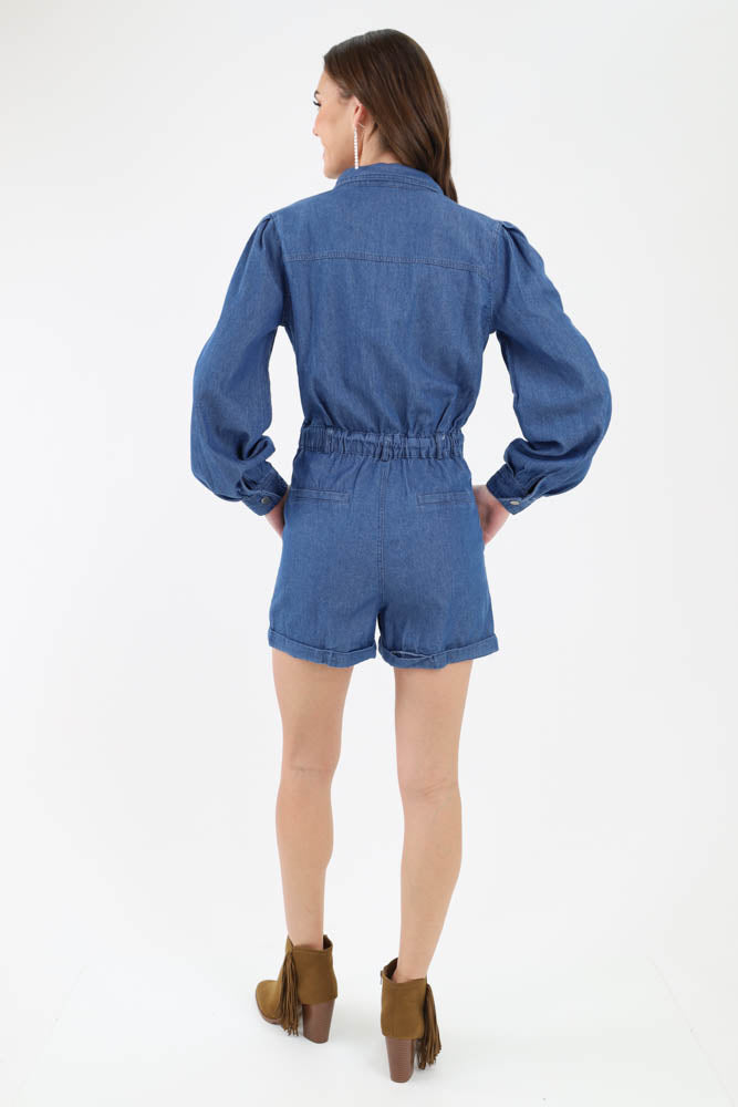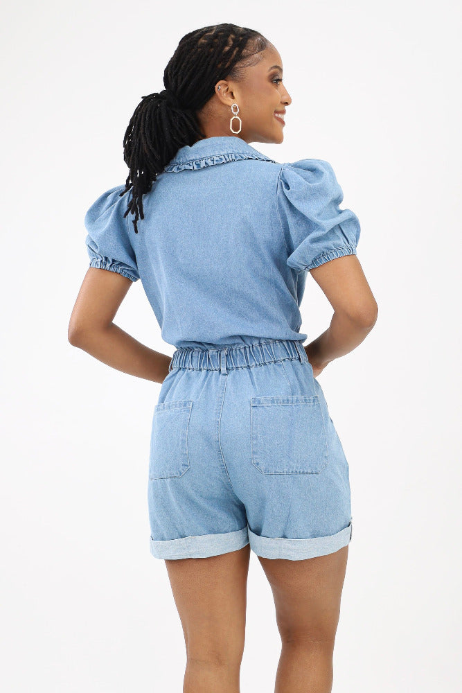 Denim Romper With Puff Sleeves - Blue
