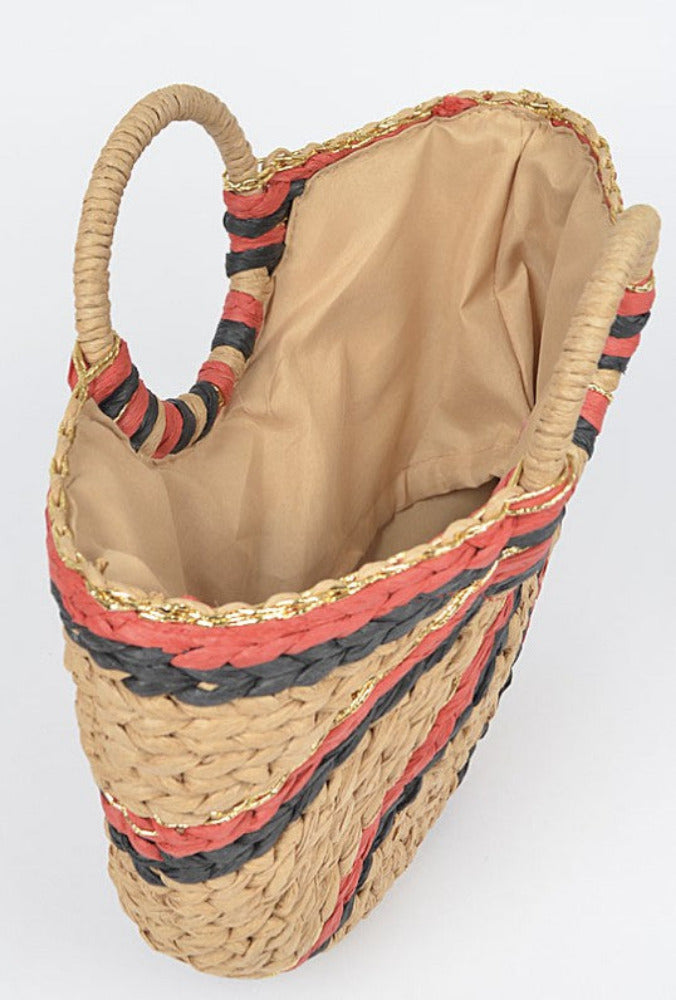 Get ready to embrace the sun with our Straw Woven Tote Bag adorned with vibrant orange, black, and gold stripes! Perfect for beach days, picnics, or a stroll along the boardwalk, this fun and beachy accessory not only adds a pop of style to your outfit but also carries your essentials with ease, making it a must-have for your sunny adventures.