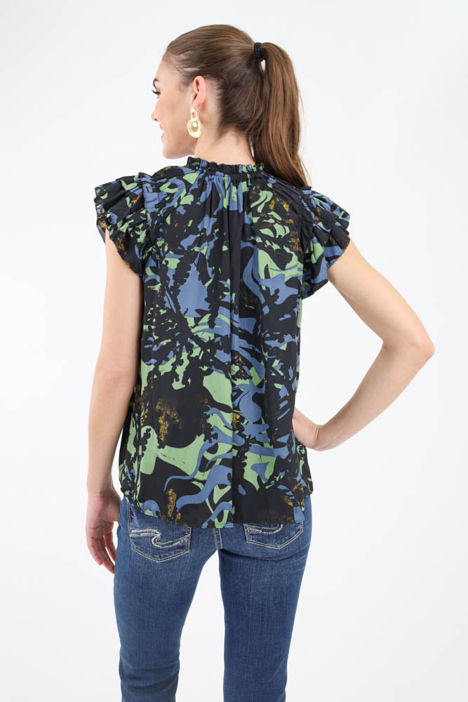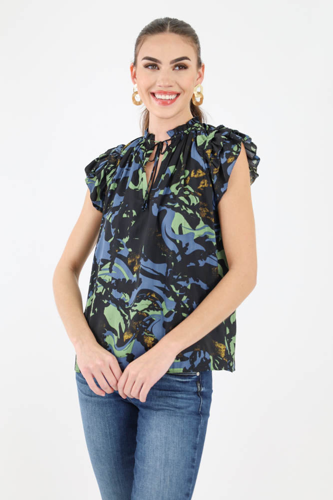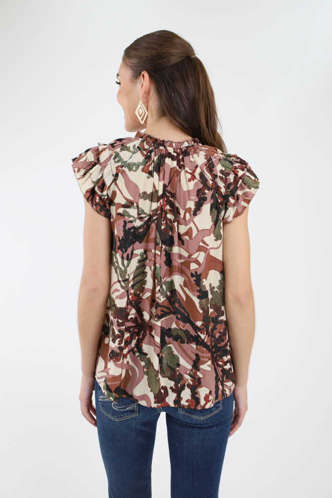 Ruffle Sleeve Satin Print Blouse