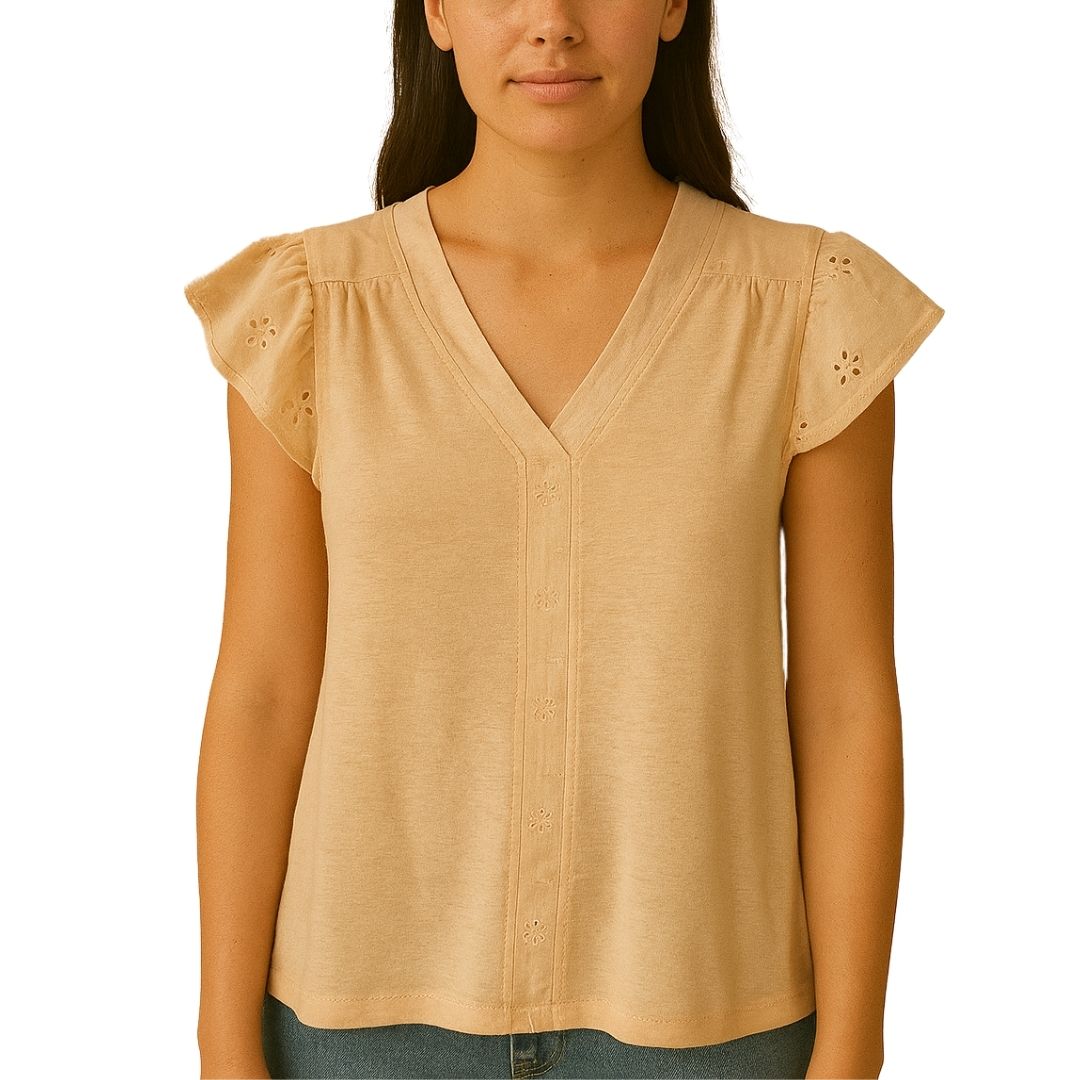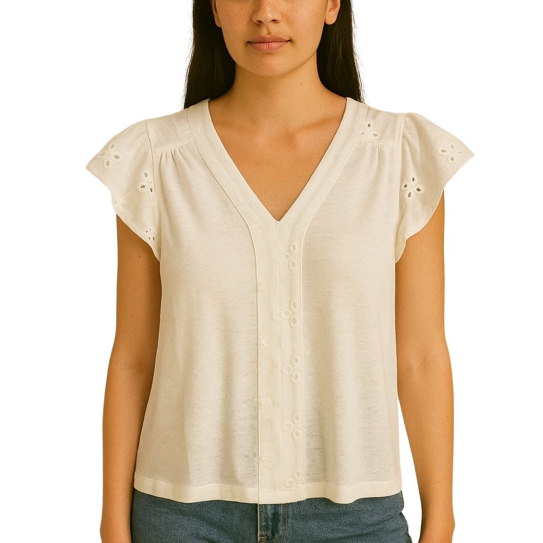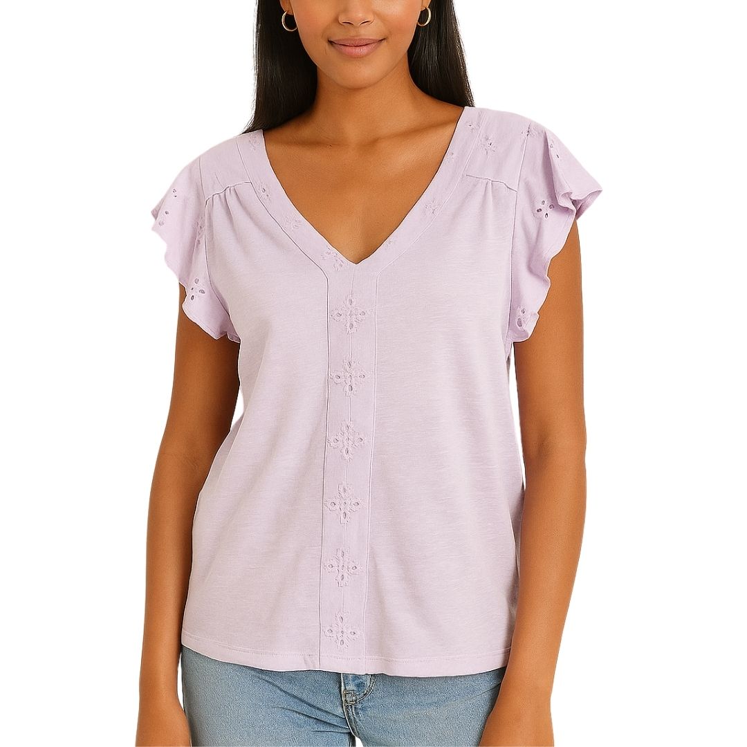 V-Neck Eyelet Lace Flutter Sleeve Top
