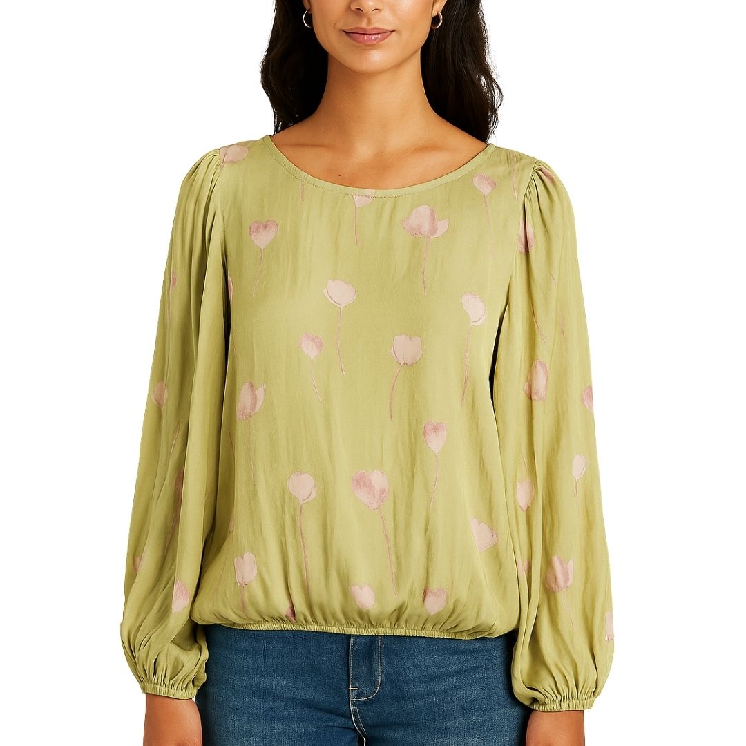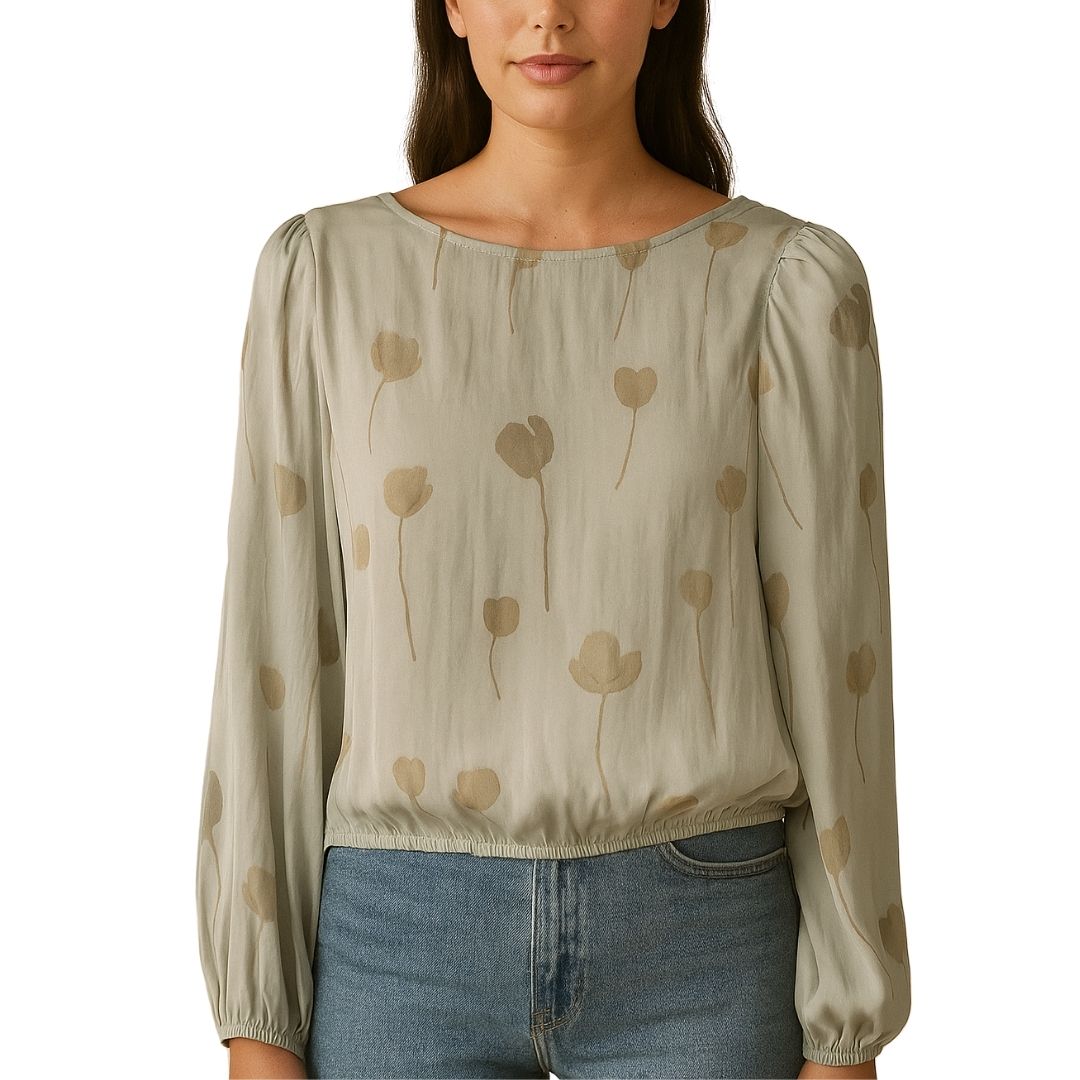 Satin Ruffle Print Blouse - Green