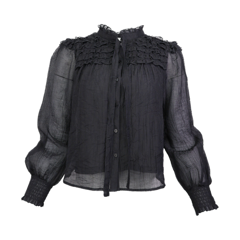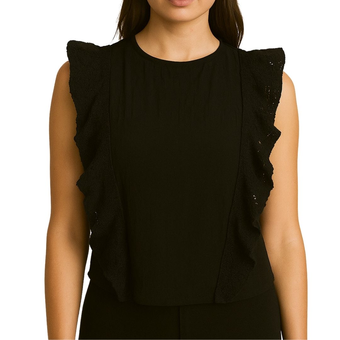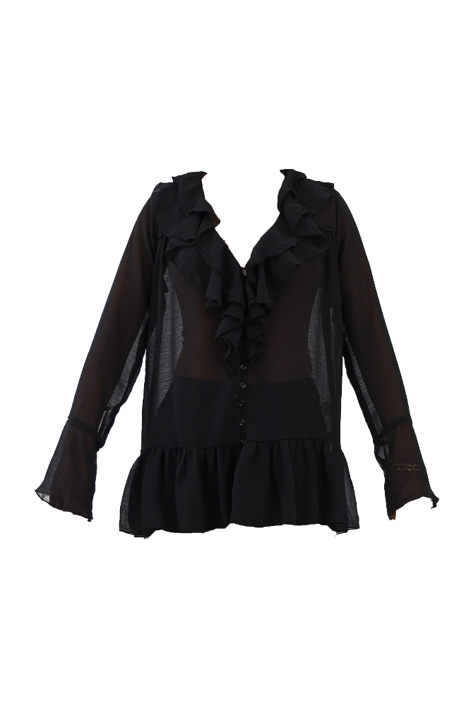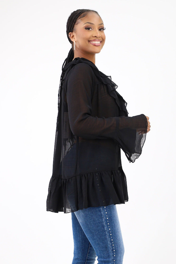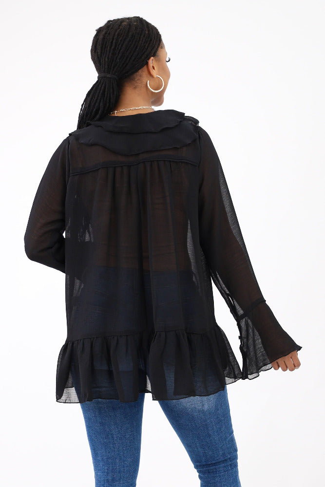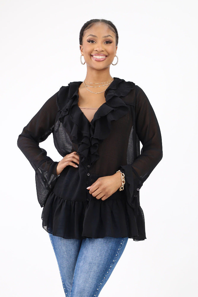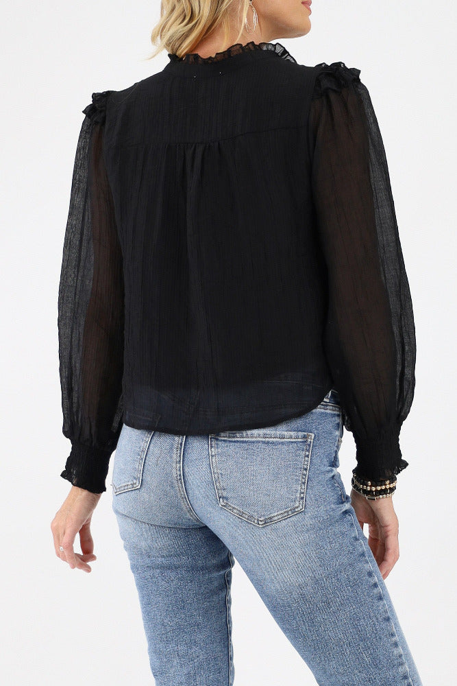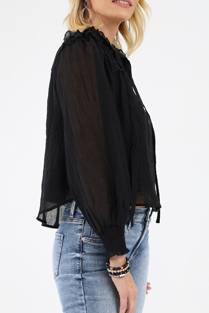 Ruffle Yoke Balloon Sleeve Top - Black