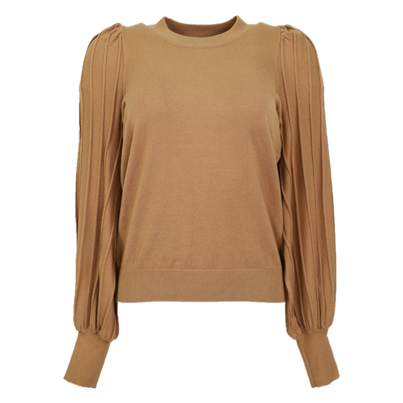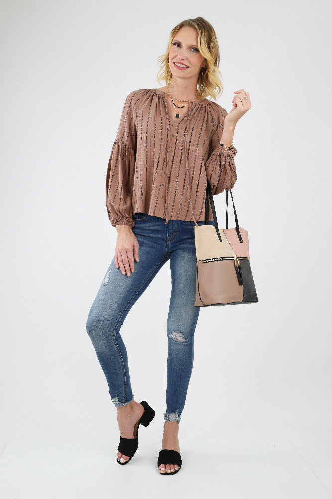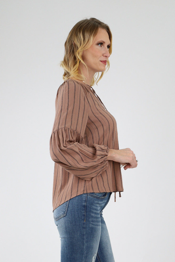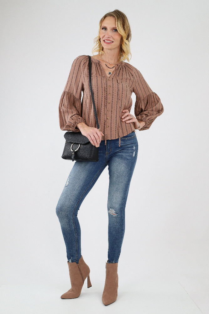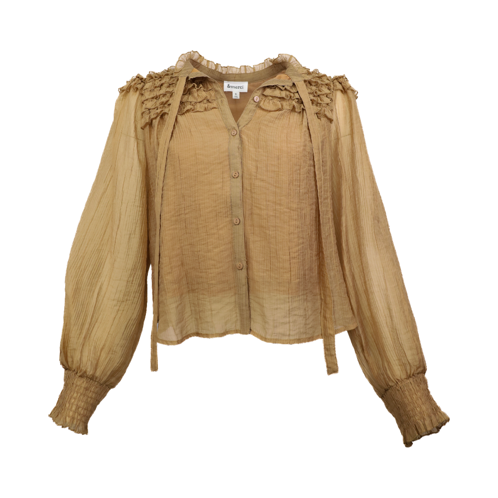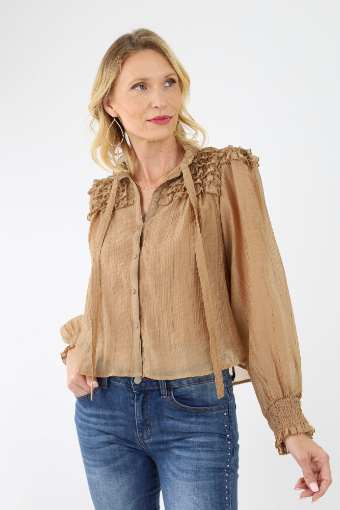 Ruffle Yoke Balloon Sleeve Top - Brown