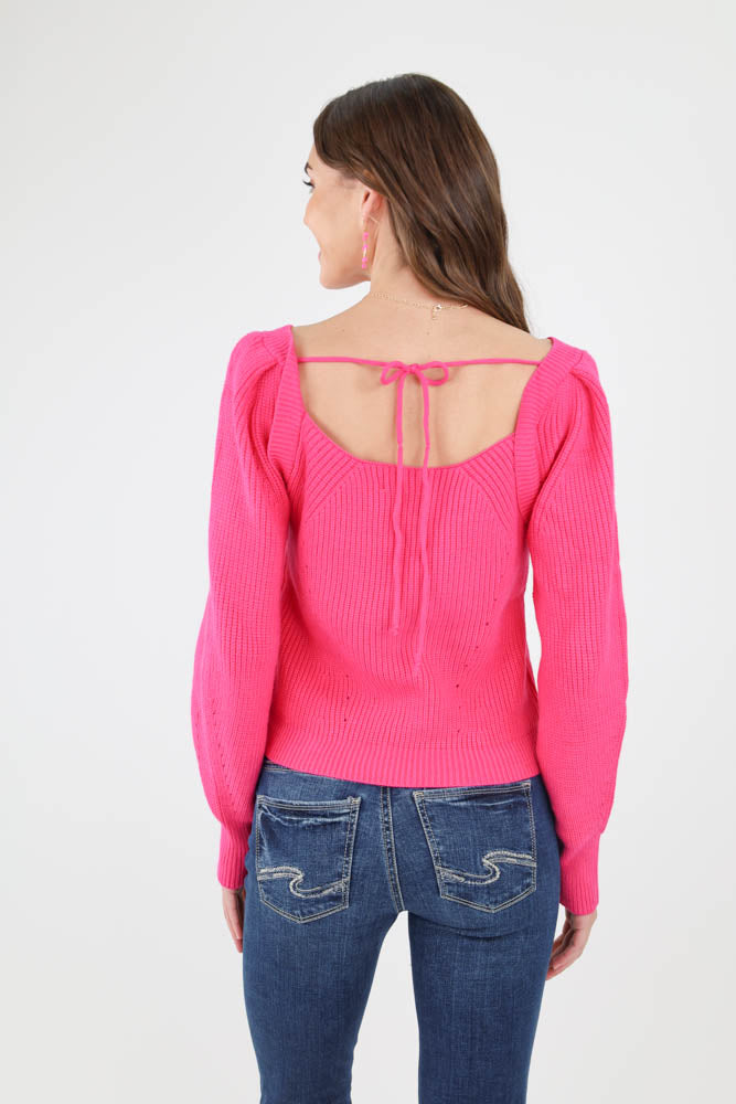 Square Neck Tie Back Sweater -Pink
