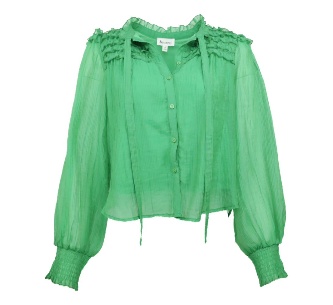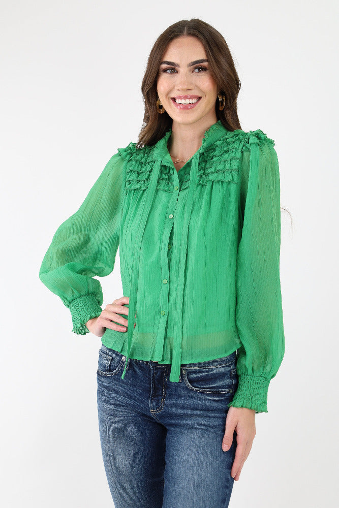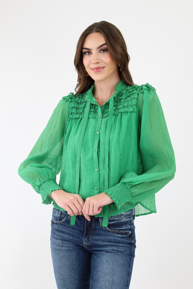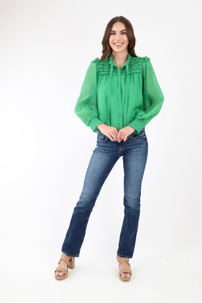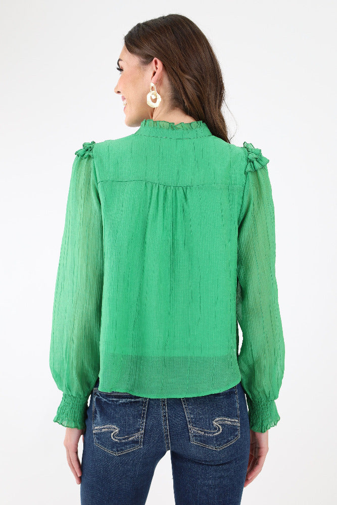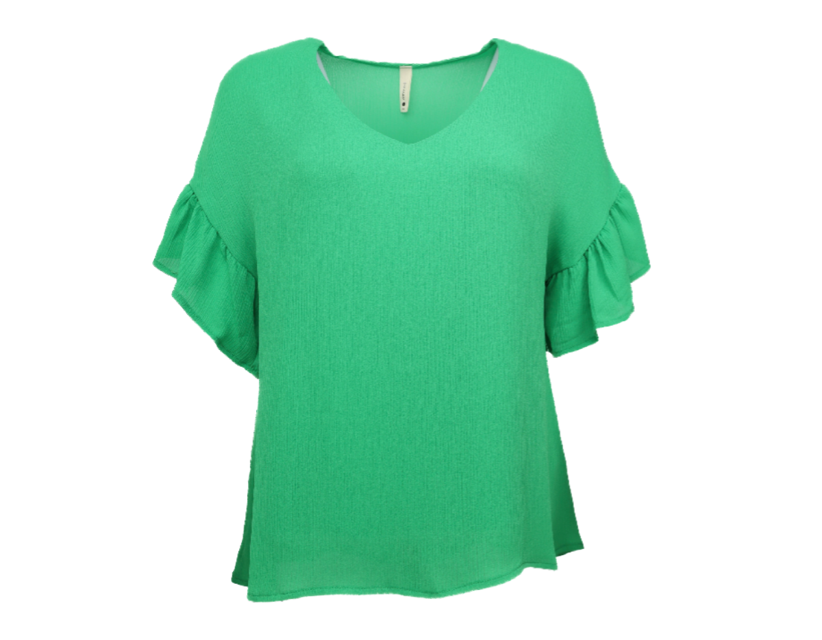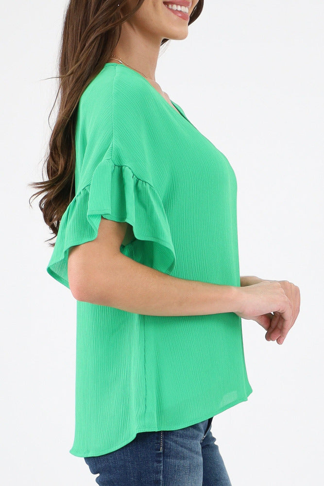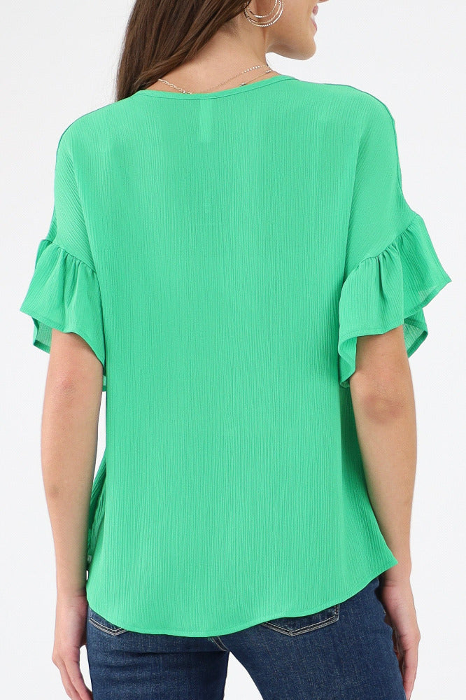Relaxed Ruffle Sleeve Crinkle Top - Green