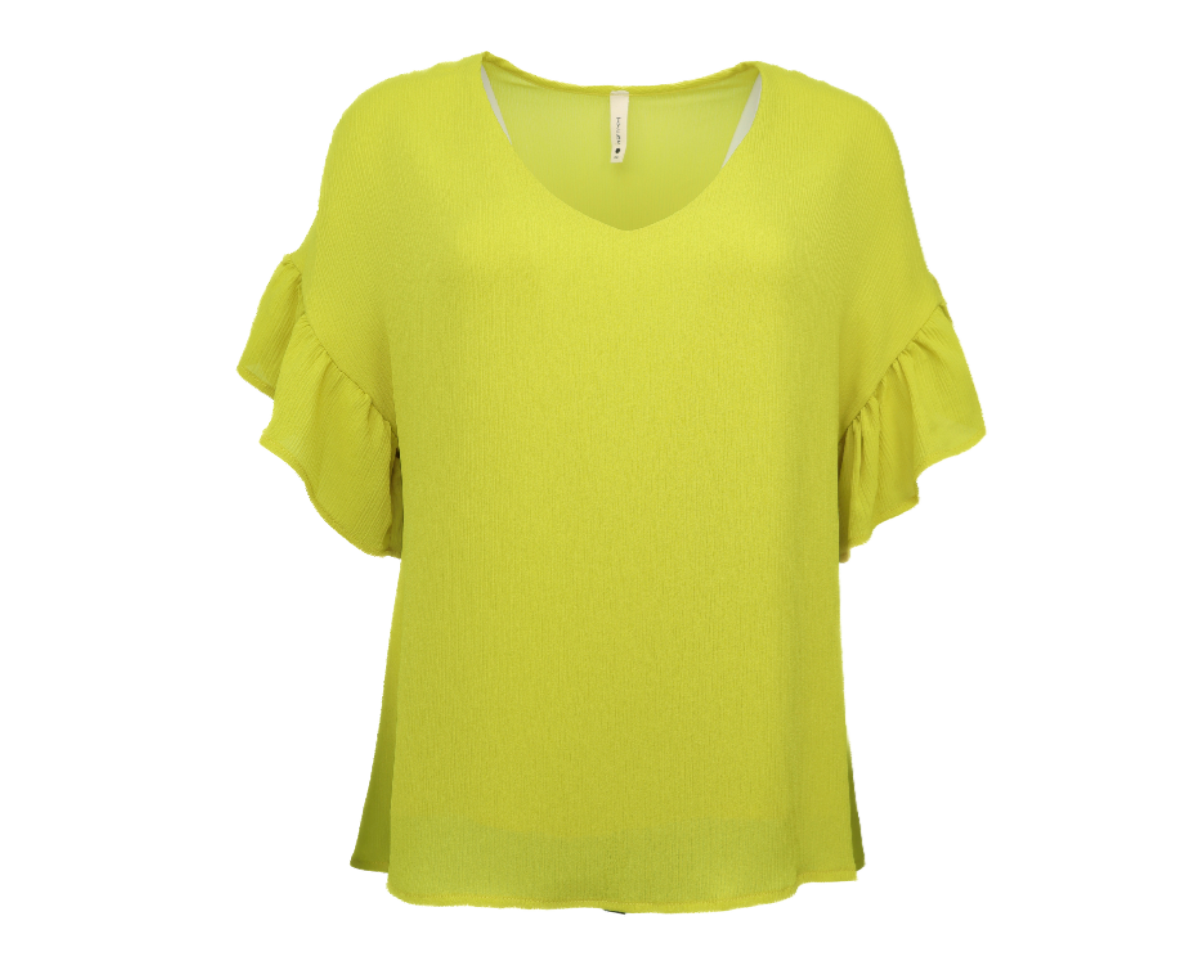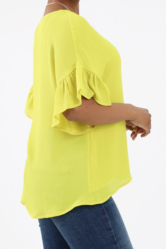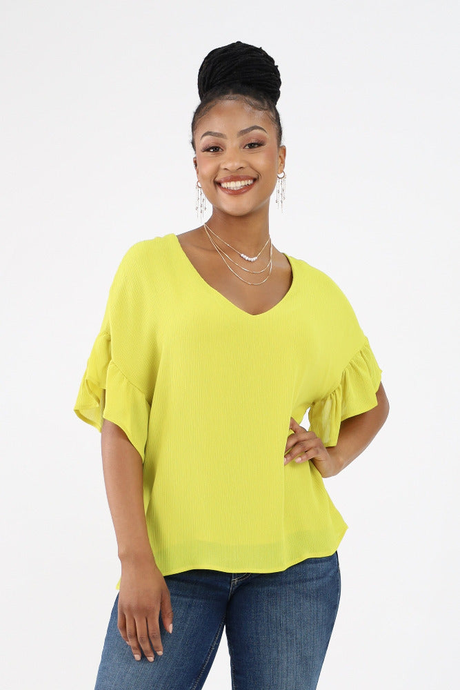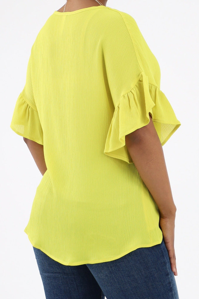 Relaxed Ruffle Sleeve Crinkle Top - Chartruse
