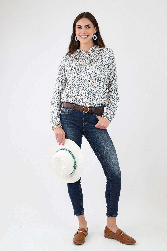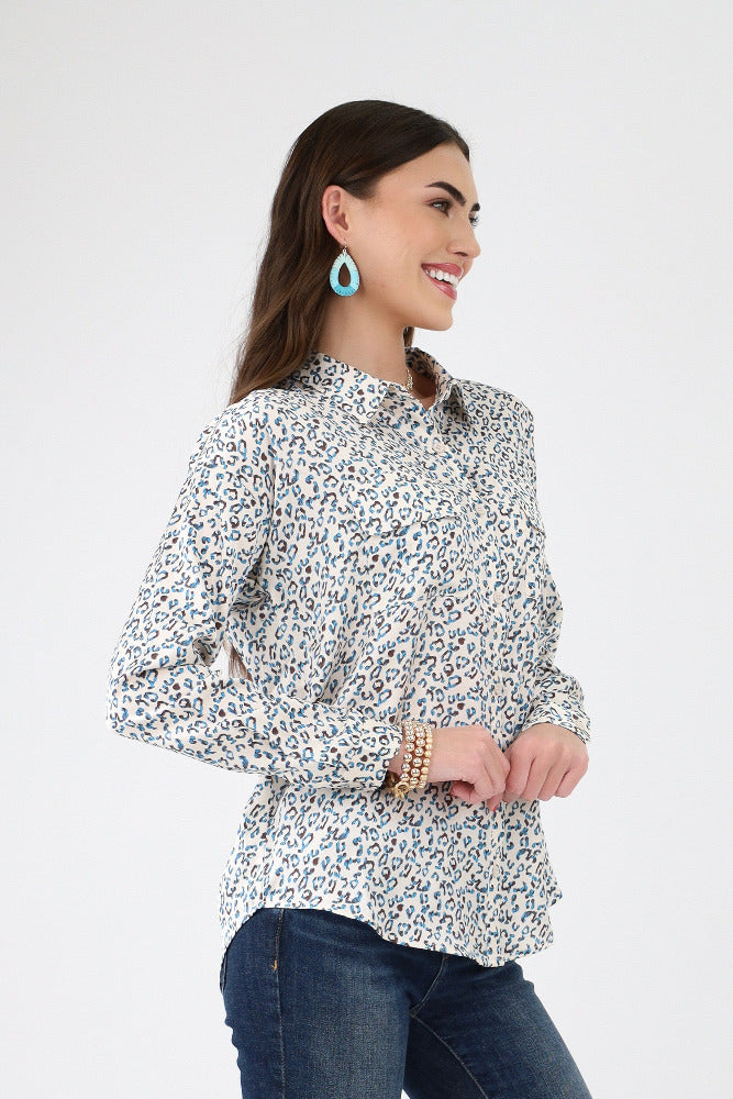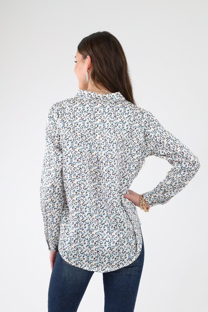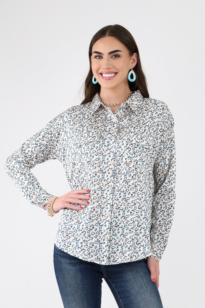 Animal Print Satin Button Up Shirt - White