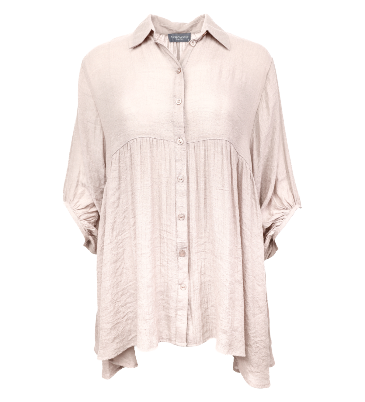 Introducing our charming babydoll shirt that boasts an effortlessly oversized, relaxed fit. Made with a lightweight, flowy woven fabric, this shirt features a button-front design, a delightful ruffle-tiered back, 3/4 sleeves, and a collared neckline. Plus, its high-low style adds an extra touch of flair.