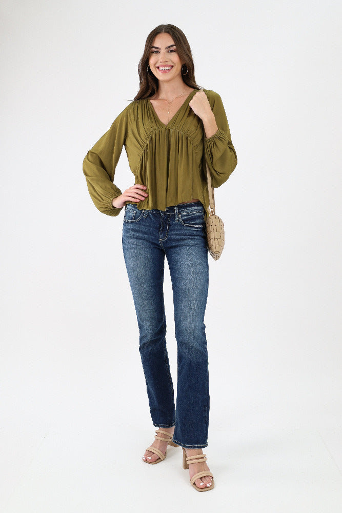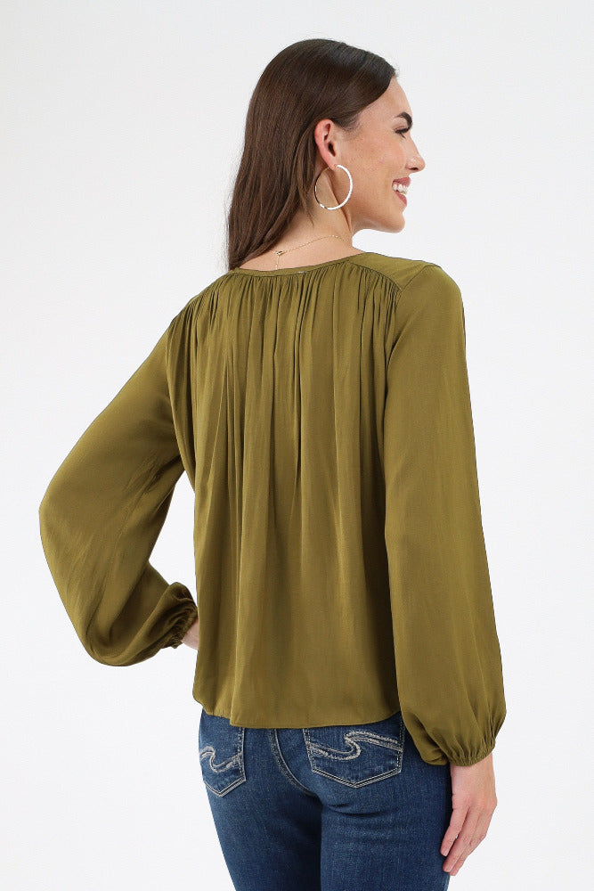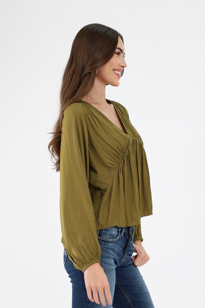Elevate your evening elegance with our V-Neck Satin Blouse. Featuring luxurious balloon sleeves and a ruched, gathered waist that creates a flattering, slimming effect, this satin blouse is a must-have for dinner gatherings and nighttime adventures.