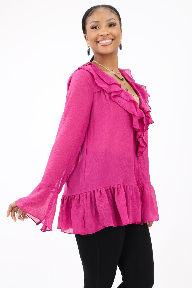 Introducing our Ruffled Button Tunic Top, a chic blend of style and comfort. Featuring feminine ruffles and a classic button-up design, this top adds flair to any outfit. Versatile for both casual and formal occasions, it's a must-have for your wardrobe. Shop now and elevate your look with effortless sophistication!