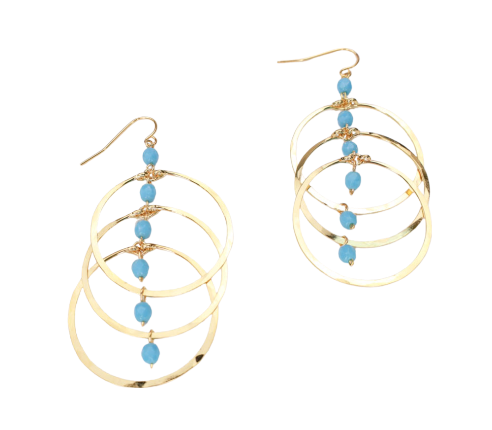 Get ready to have some fun with our Layered Circle Dangle Drop Earrings, adorned with playful blue bead details, adding a pop of color and a whimsical touch to your look.