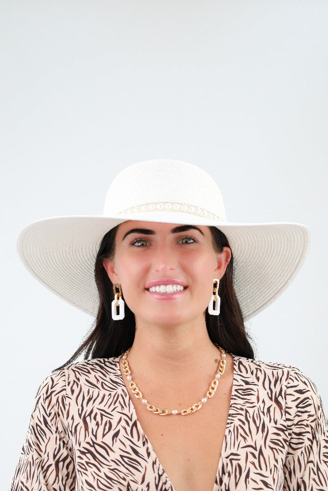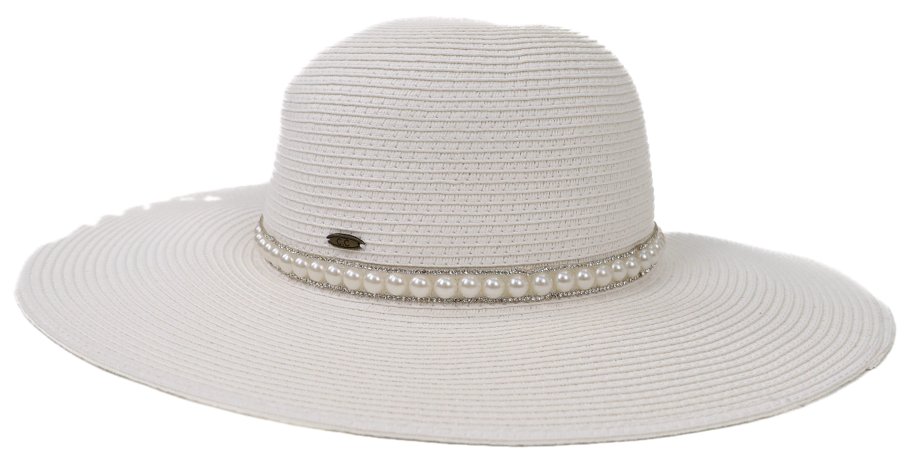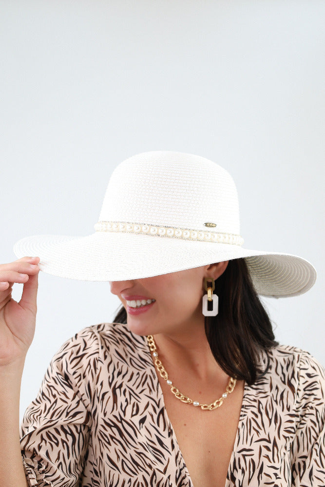 Straw Wide Brim Sunhat with Pearl Trim Band - White