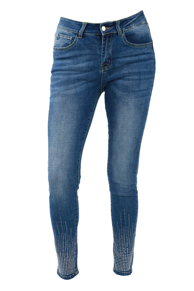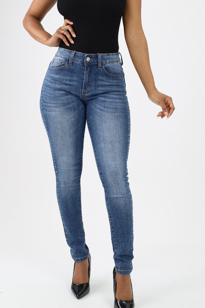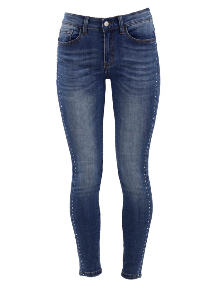 Side-Seam Stone Accent Skinny Jeans - Blue
