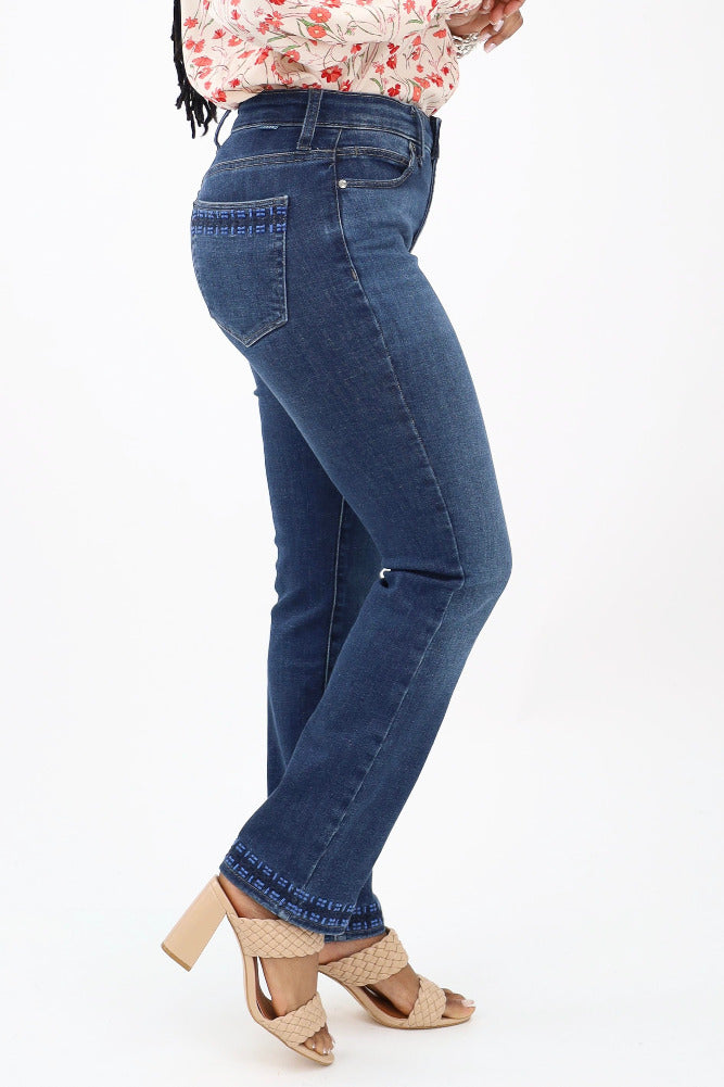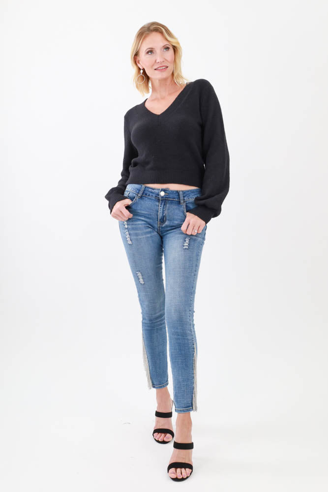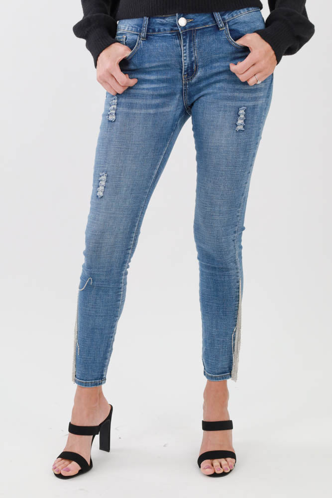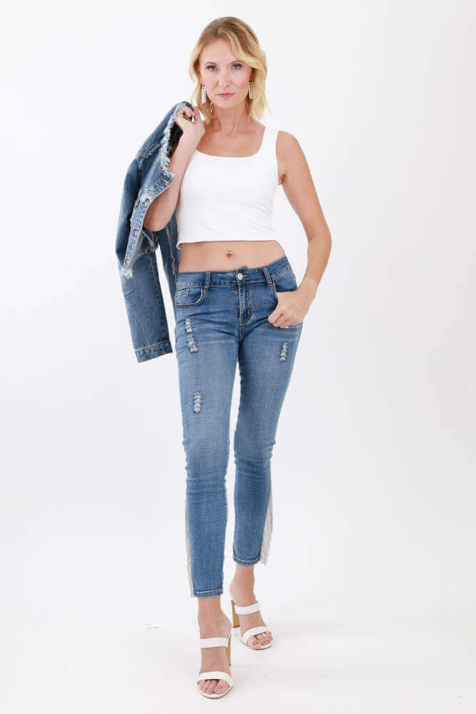 Rhinestone Fringed Jeans - Blue