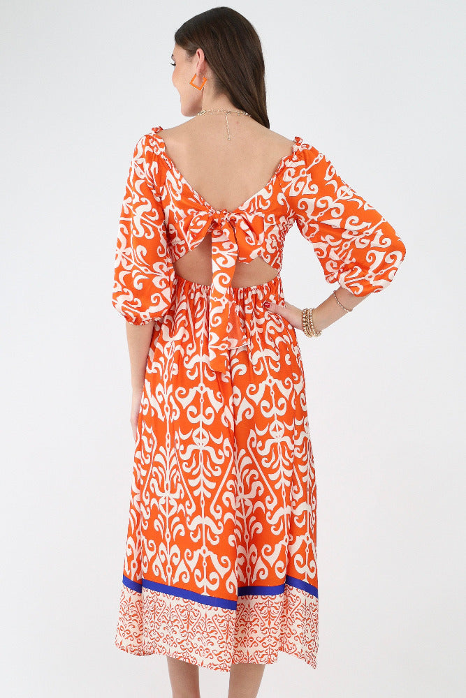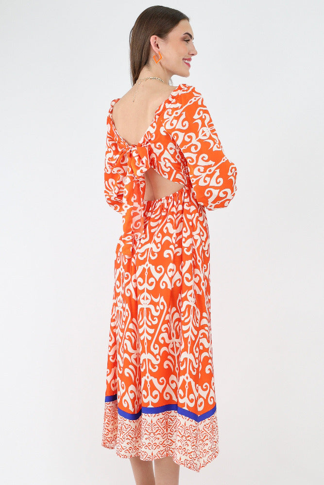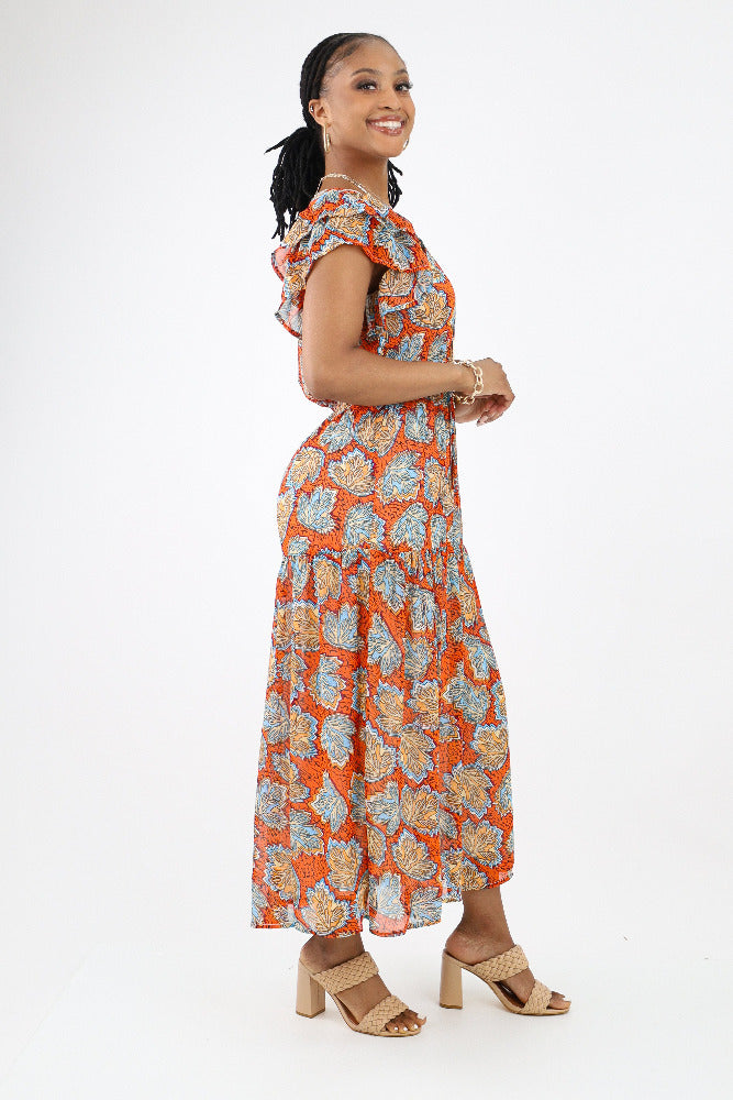 Leaf Print Floral Maxi Dress - Orange