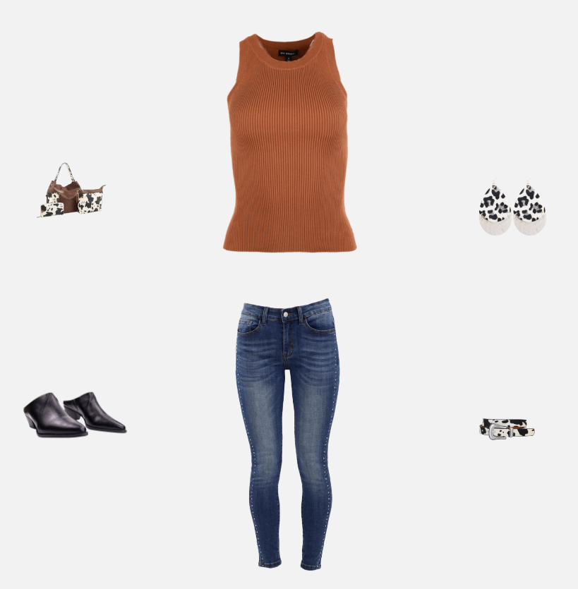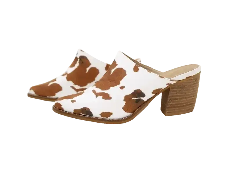 Pointy Toe Cow Print Stack Mules - Brown