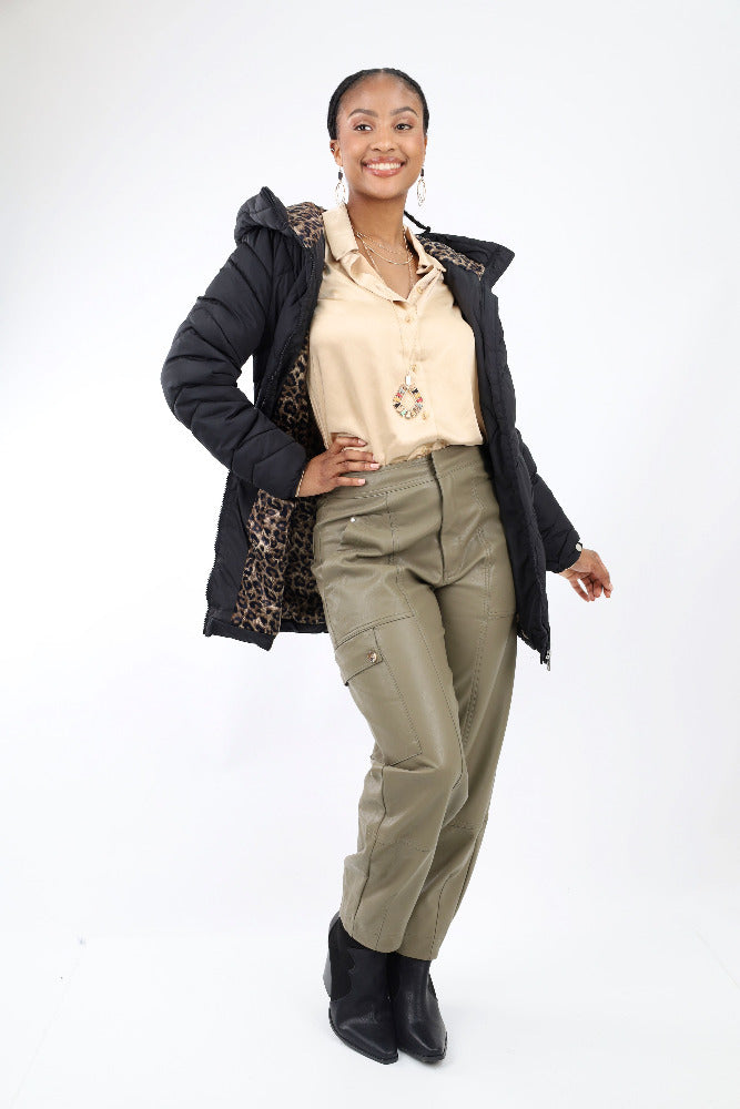 Revamp your wardrobe with our Faux Leather Utility Cargo Pants – they're more than just pants; they're a fashion-forward adventure. These pants combine the edginess of faux leather with the practicality of cargo details, making them perfect for both style and function. Embrace the bold attitude and elevate your everyday look with these pants that effortlessly command attention and exude contemporary cool.