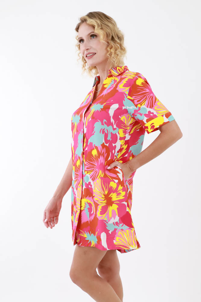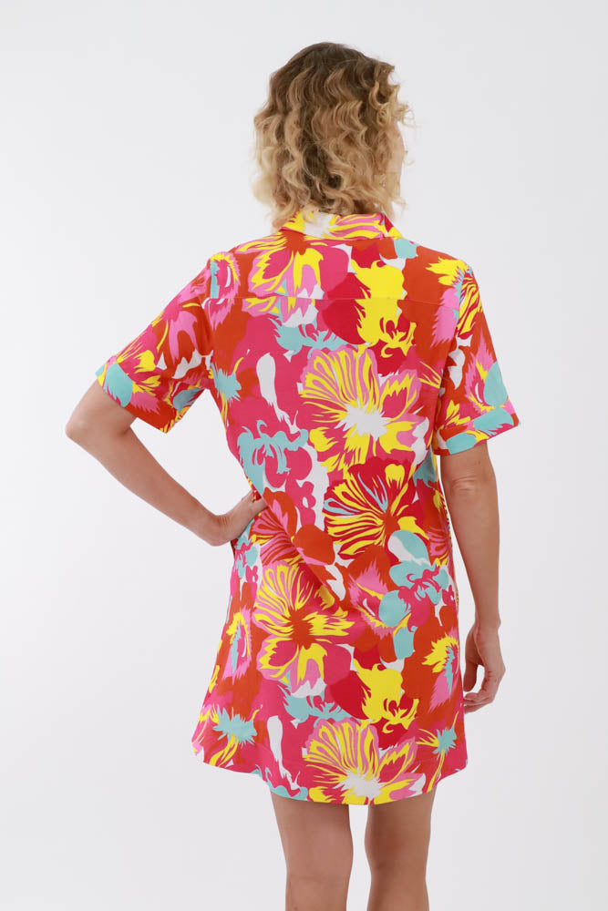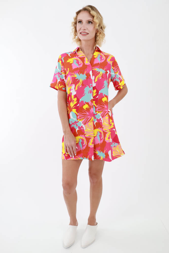 Its vibrant print and easy button-down style capture the essence of laid-back island living, making it the perfect choice for a beach vacation or a sunny day out. Embrace the breezy vibes and let this button down dress be your go-to piece for a chic and carefree look that's perfect for embracing the warm weather and tropical spirit.
