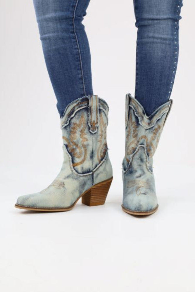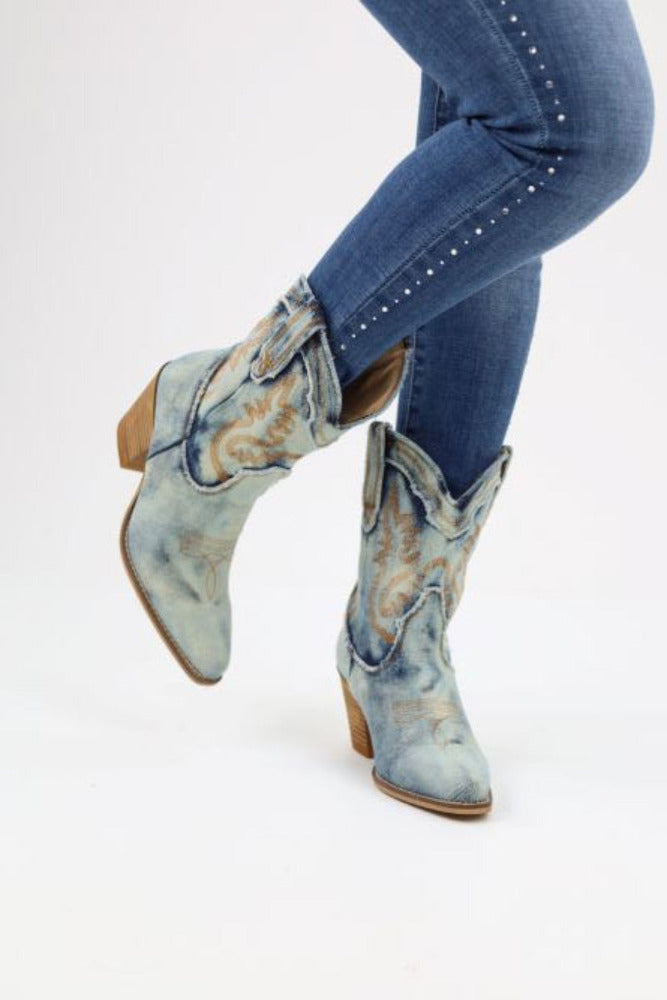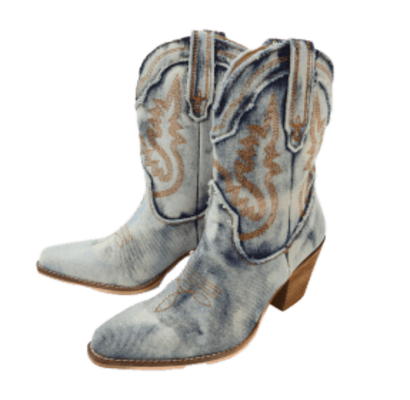Step into rugged elegance with our Denim Western Boots. Featuring intricate brown stitch details. Whether you're on the ranch or out for a night on the town. These boots blend classic denim style with Western flair. our Denim Western Boots are the perfect choice for a unique denim look.