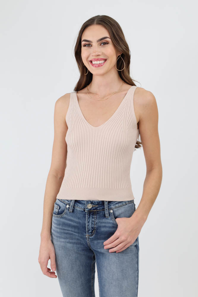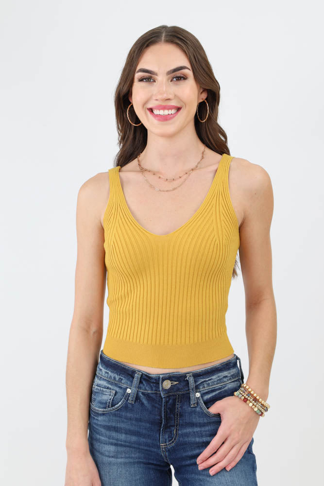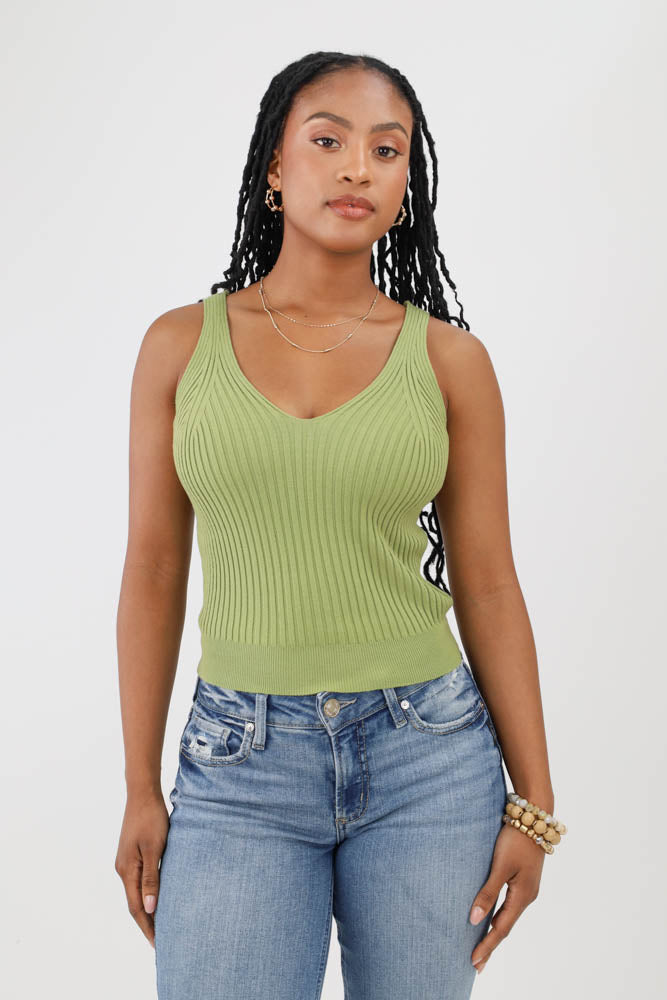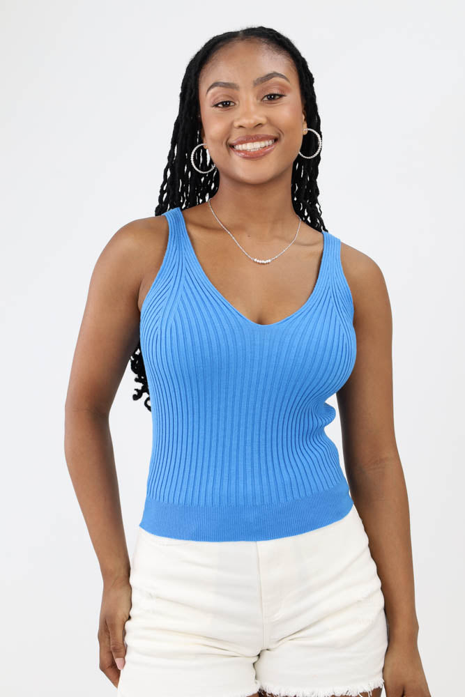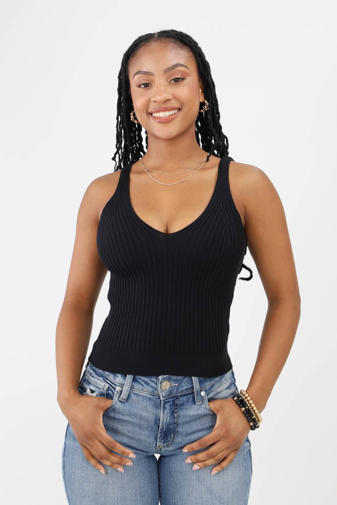 This must-have layering top features a front and back V-neck, lightweight soft ribbed fabric with stretch for easy fitting, solid color, and tank top sleeves, making it an ideal choice for casual and versatile wear.