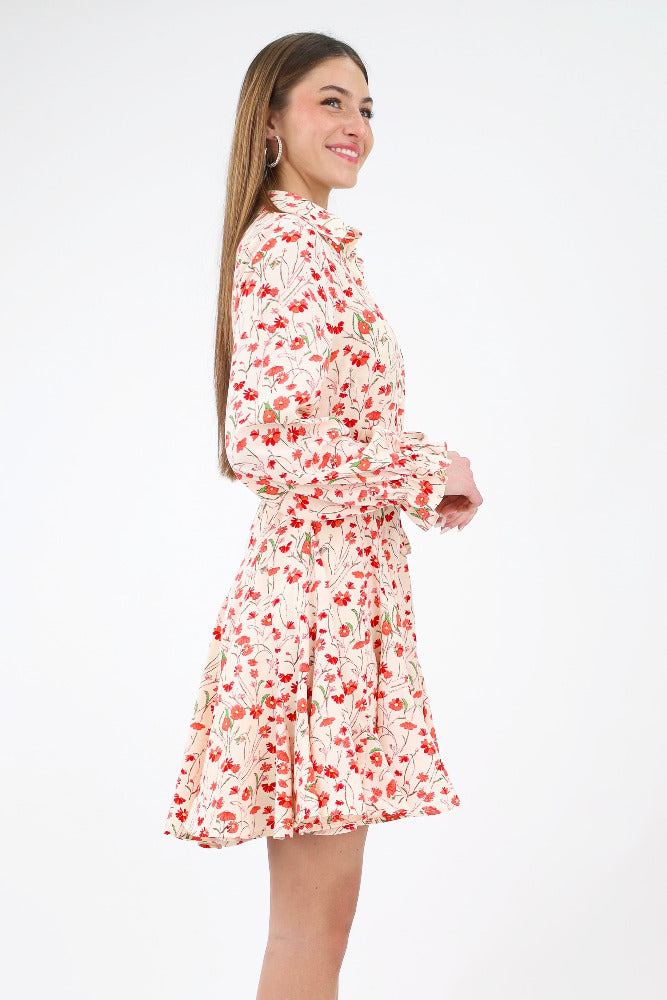 Embrace a touch of whimsical charm with our Fit and Flare Shirt Dress. The delicate floral pattern and waist string detail create a flattering and playful silhouette, making this dress a perfect choice for those who appreciate feminine elegance with a hint of flair.