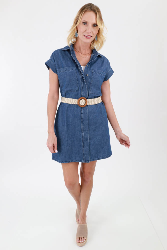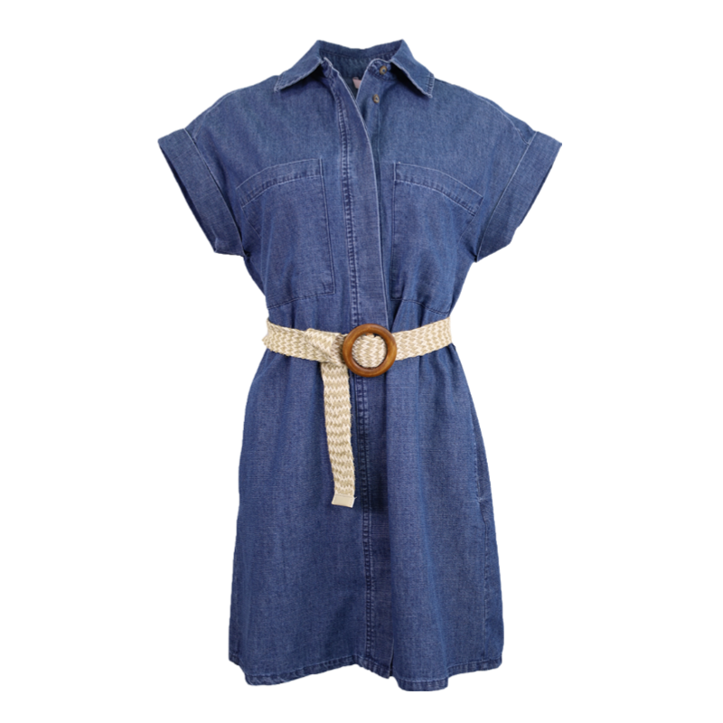 Get ready to make a fashion statement with our Mini Denim Shirt Dress! This super fun dress, complete with a paired belt, cap sleeves, and a collared neckline, is perfect for daytime outings with sandals, and when you add some heels, it becomes a show-stopping look that's ideal for those summer parties.