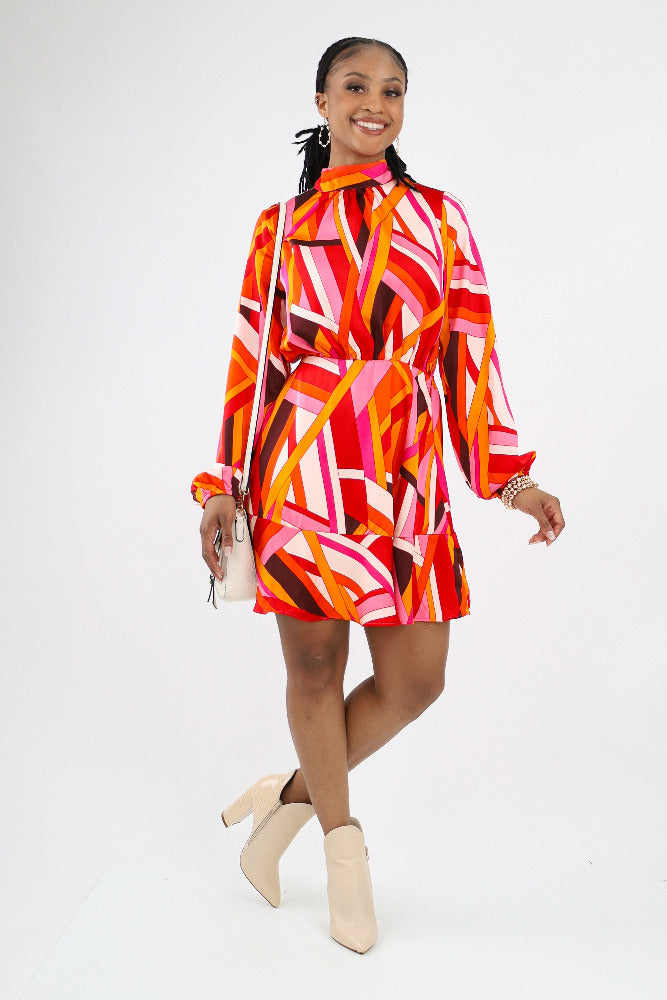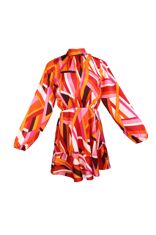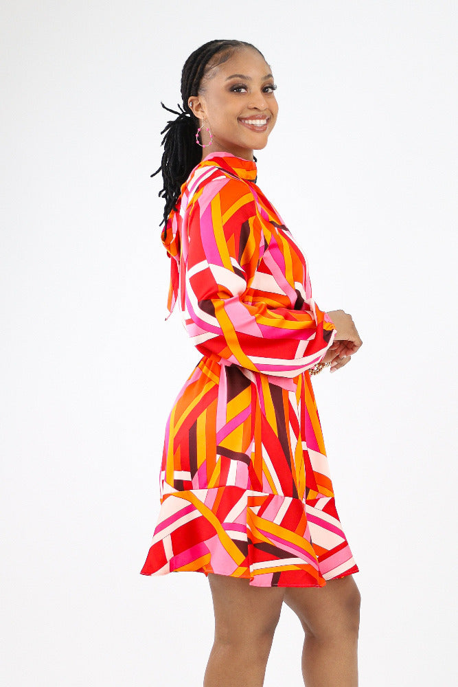 Turn heads in our Geo Print Back Tie Ruffle Hem Mini Dress! This playful yet sophisticated dress features a captivating geometric print, a flirty ruffle hem, and a stylish back tie for a touch of charm. Elevate your look with this chic and on-trend mini dress that's perfect for making a statement.