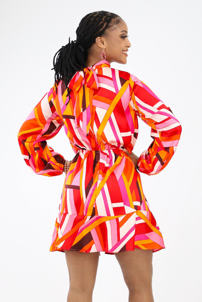 Geo Print Back Tie Ruffle Hem Dress - Multi