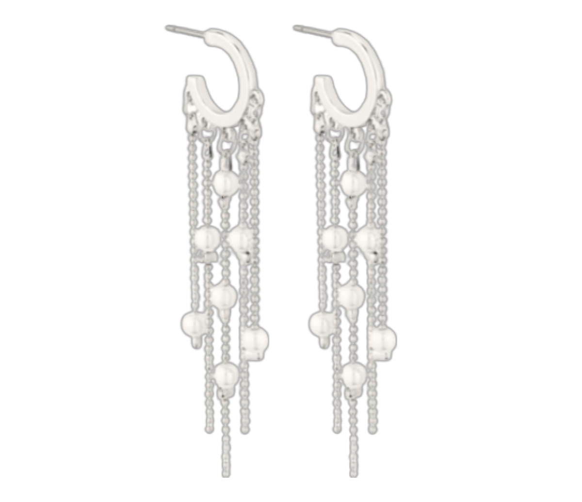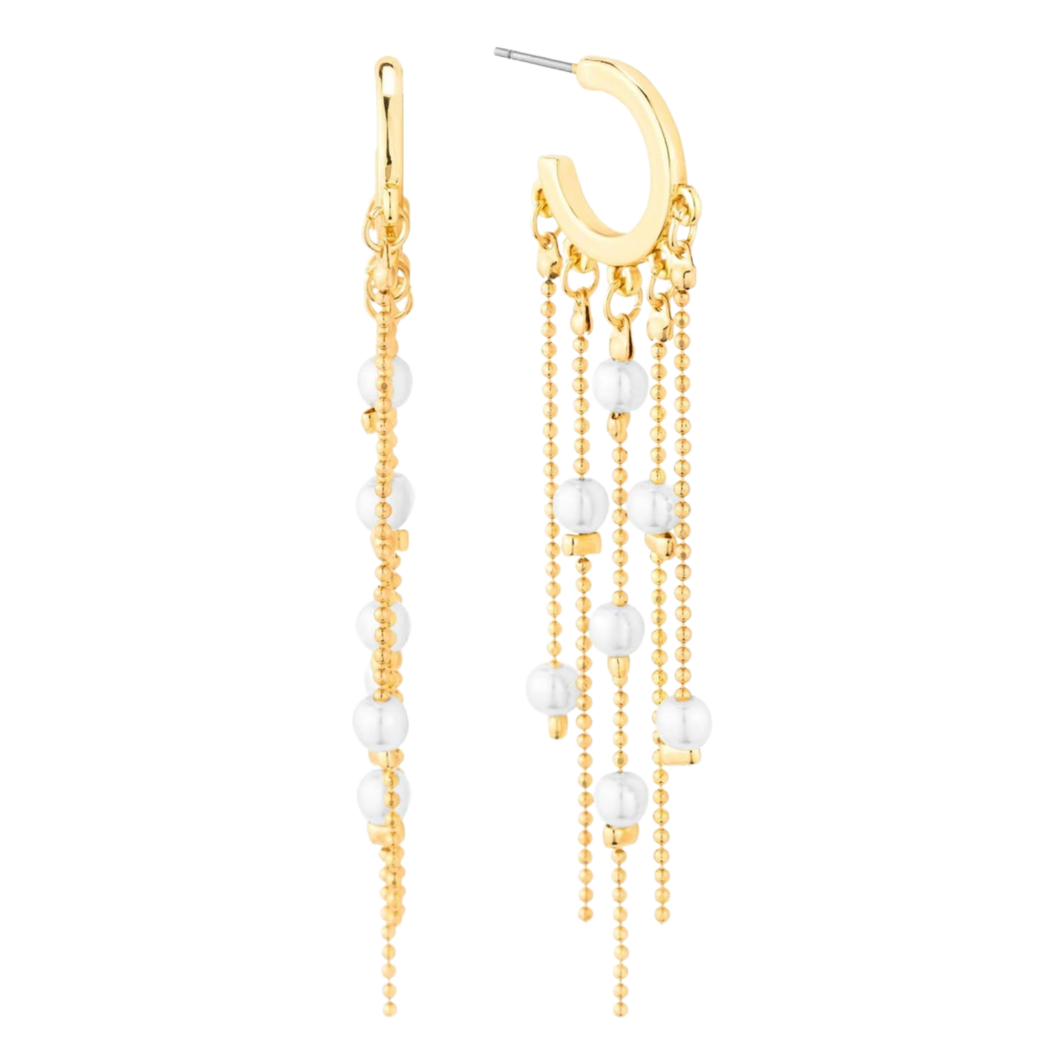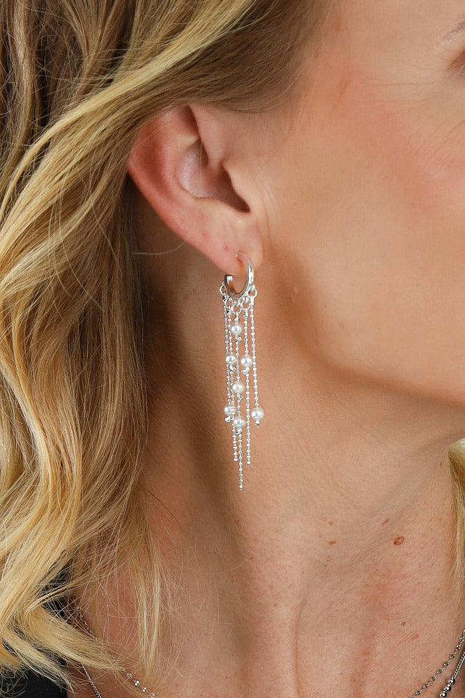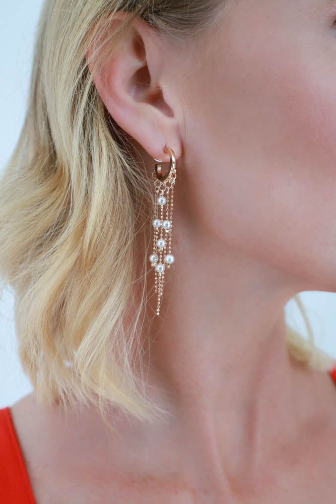 Add a touch of pearl delicacy to your outfit with these Gold Chain Pearl Embellished Earrings, designed to gently hug the bottom of your ear and hang elegantly at 2 inches for a timeless and sophisticated look.