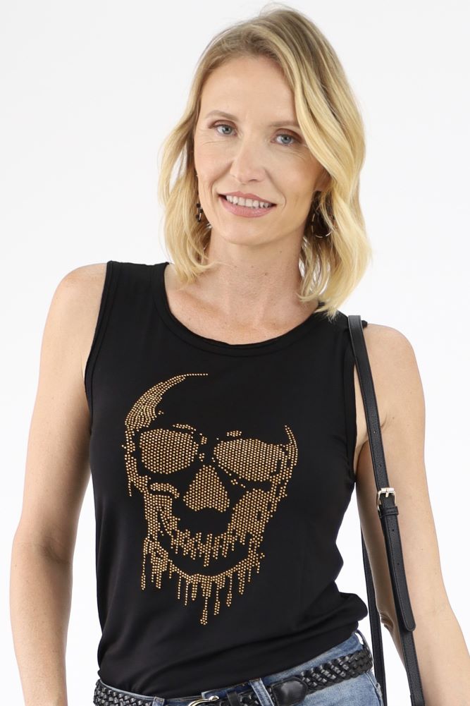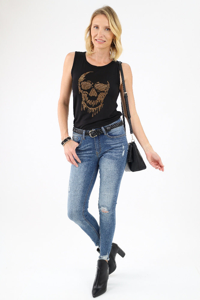 Rock a cool and edgy vibe in our black skull tank top with a skull design. The bold motif adds a touch of rebellion to your style. Versatile and fearless, it pairs effortlessly with different bottoms for a standout look. Whether you're aiming for a laid-back or rocker-chic vibe, this skull tank top has you covered for a unique and daring style statement.