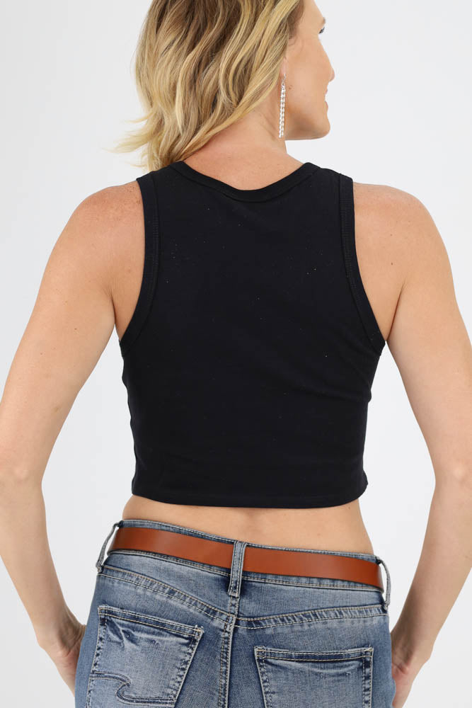 Introducing a chic and unique sleeveless graphic tank top adorned with exquisite wing and stone embellishments. This cropped beauty will have you looking effortlessly stylish and ready to stand out from the crowd.