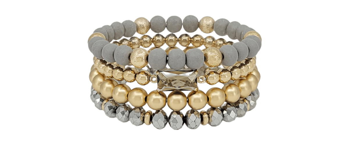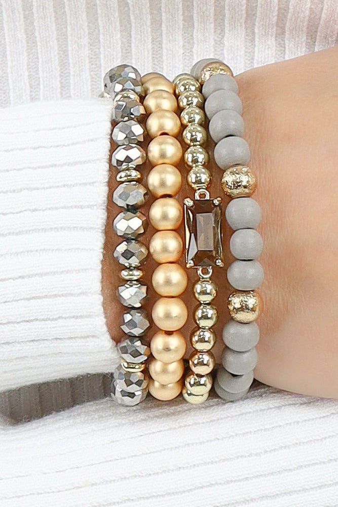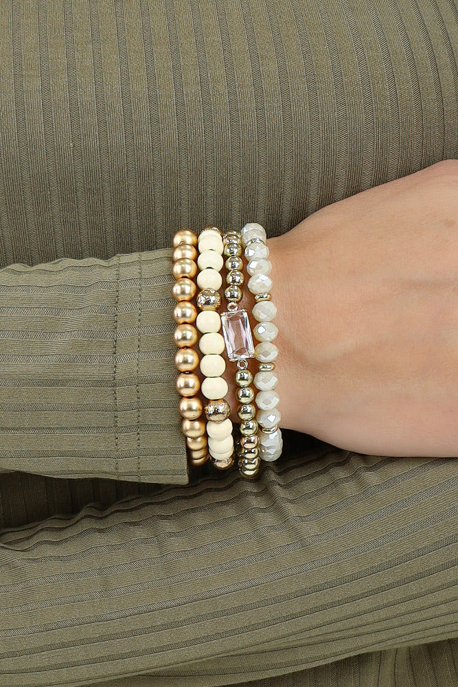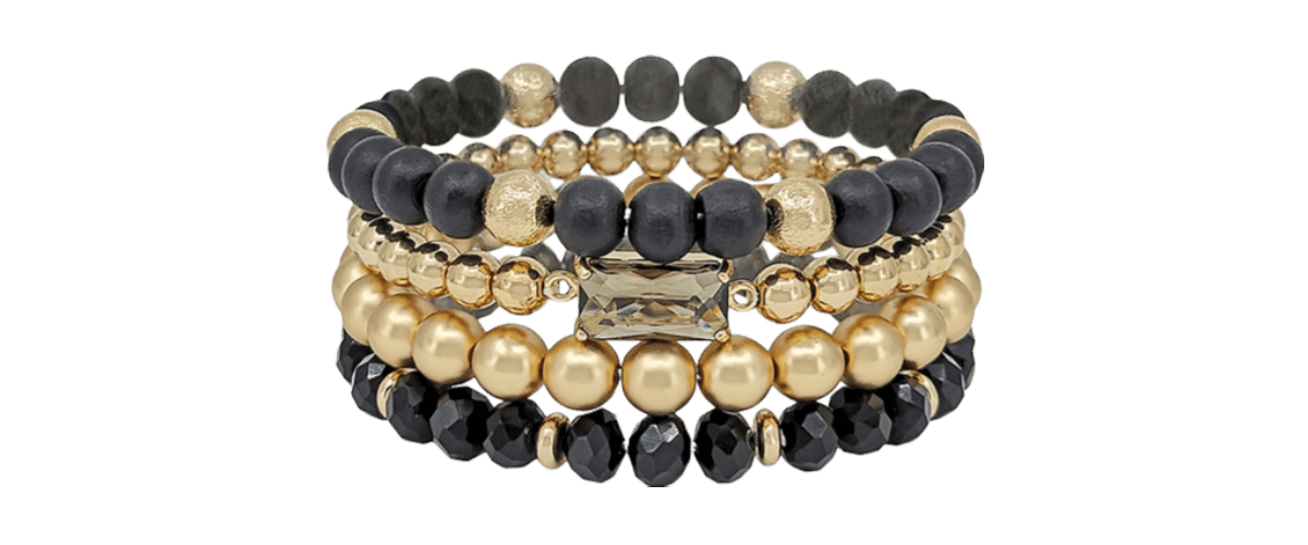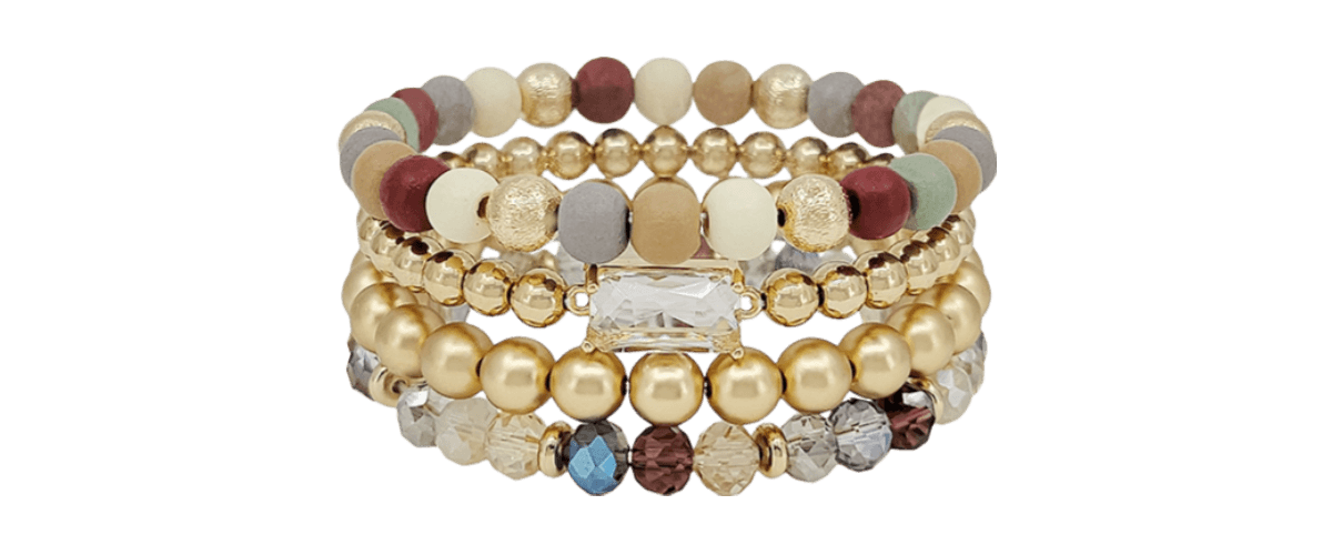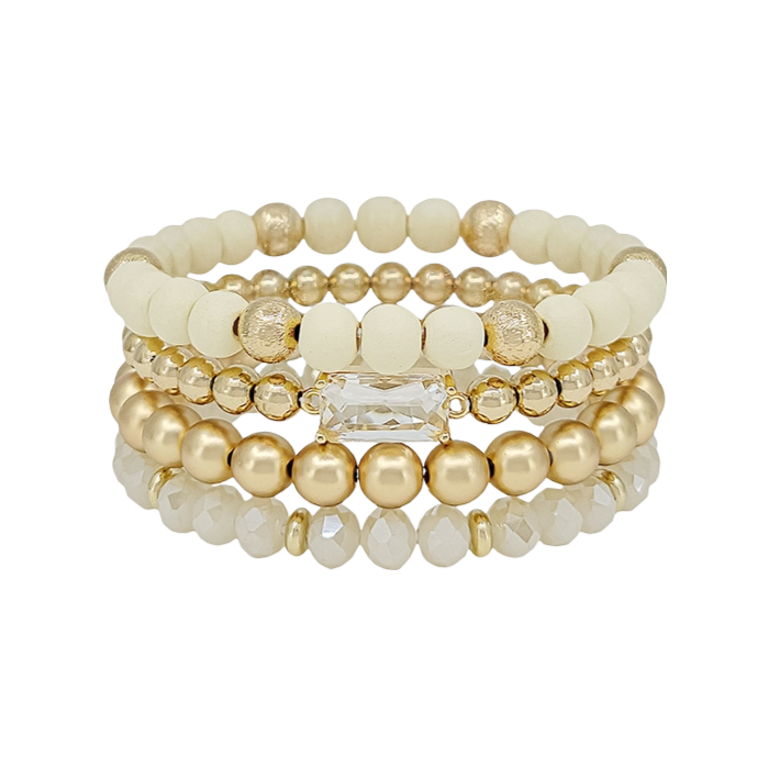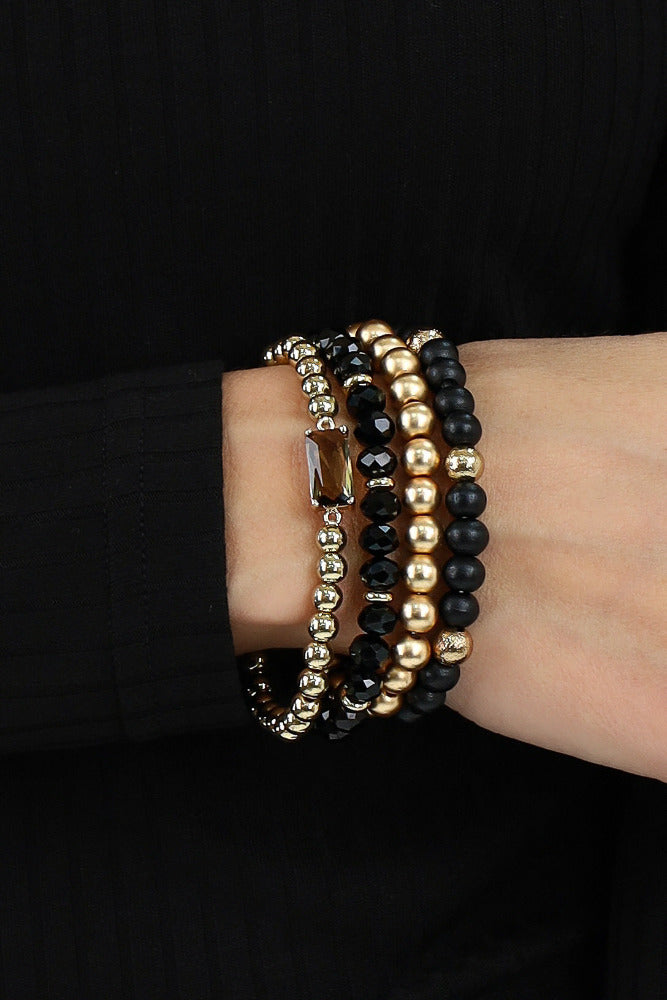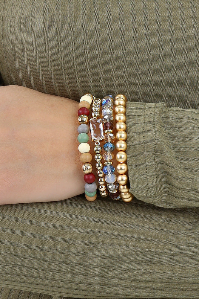 Wood and Crystal Beaded Set of 4 Stretch Bracelets