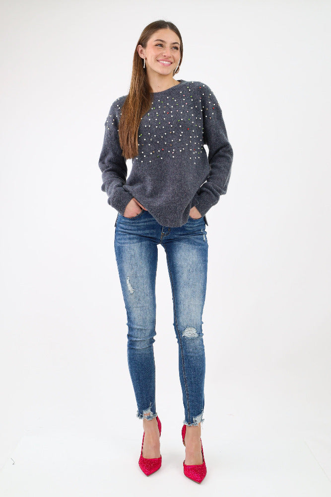 Round Neck Pearl Sweater - Gray
