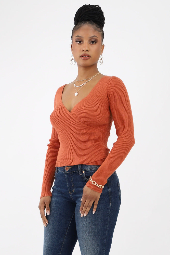 Surplice Ribbed Sweater Top -Clay