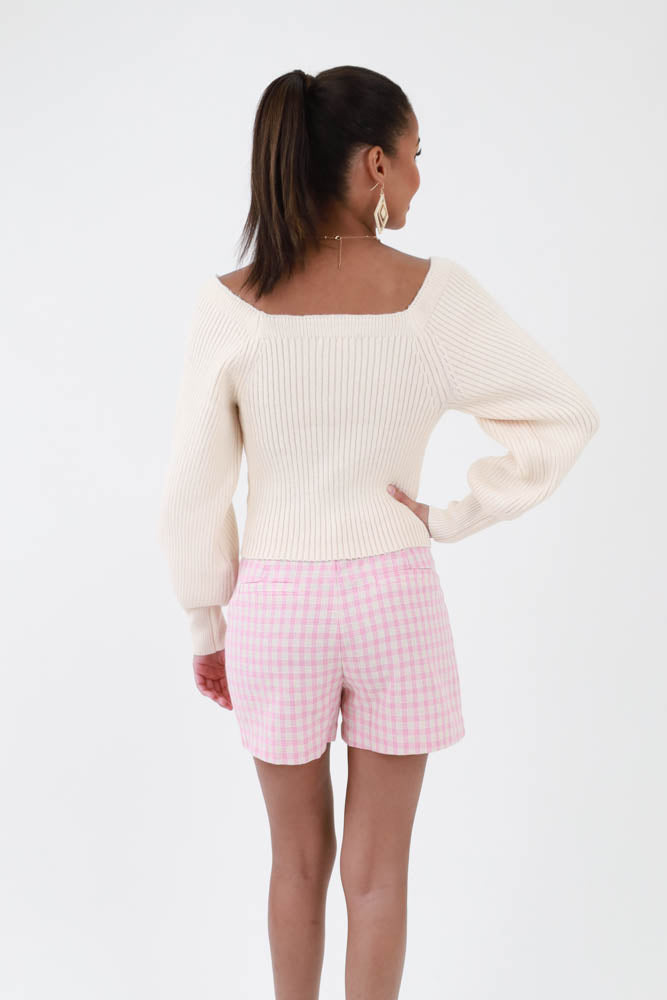 Square Neck Tie Back Sweater -Pink
