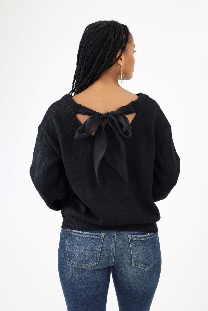 Square Neck Tie Back Sweater -Black