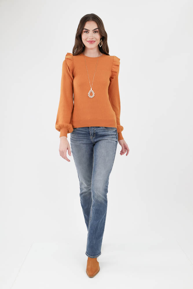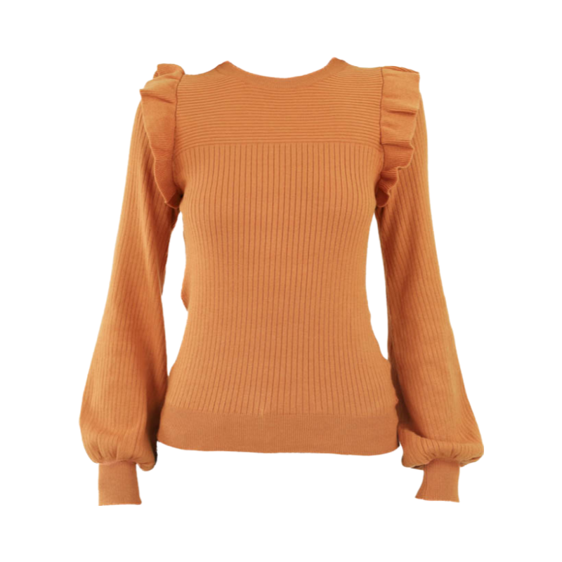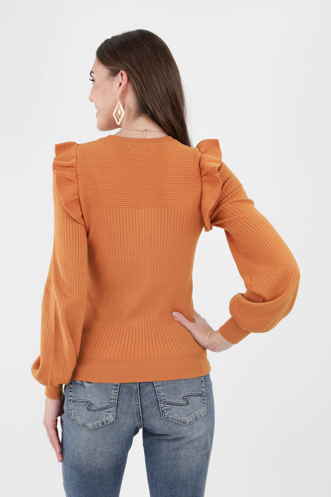 Shoulder Ruffle Crew Neck Sweater -Ginger