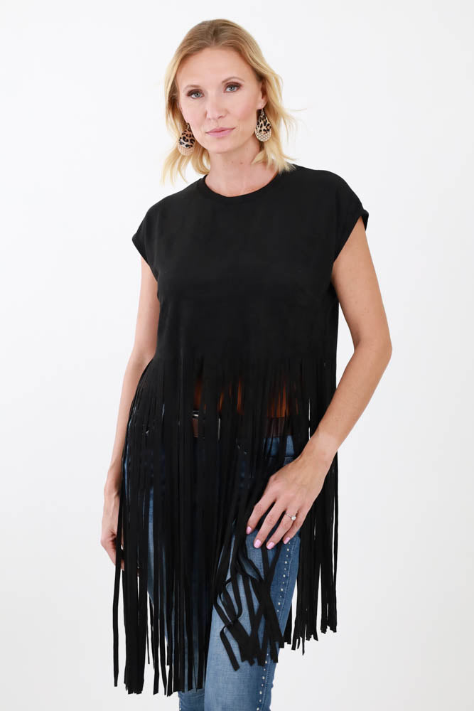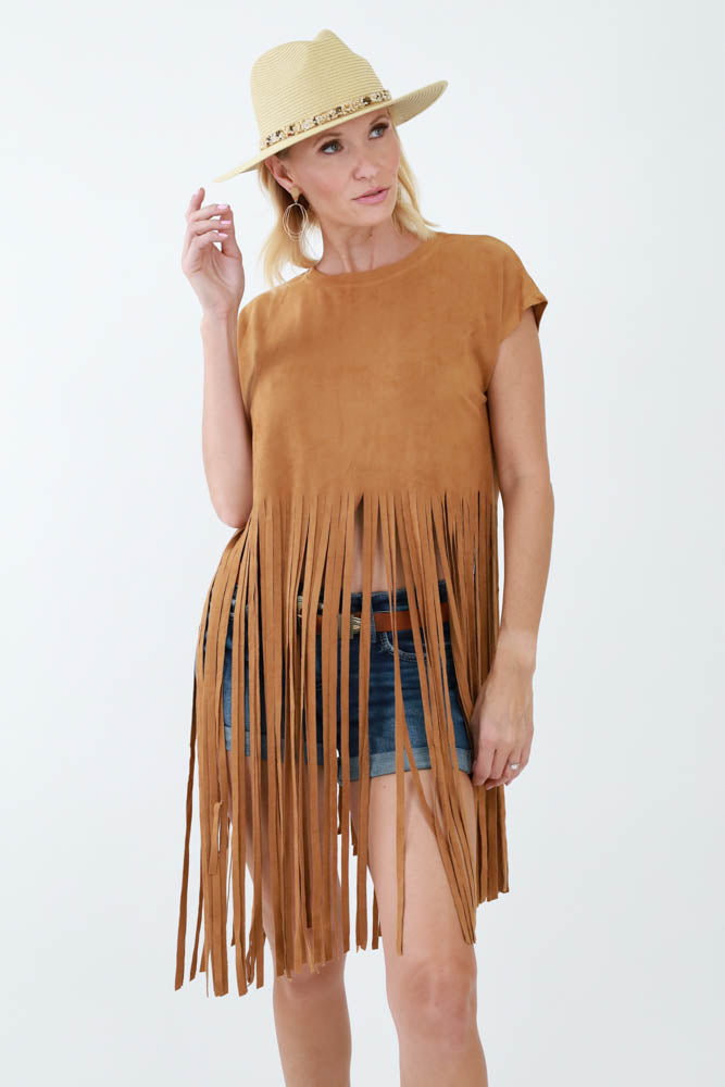 Saddle up for a country-inspired adventure with this playful suede top featuring stylish fringe detail—a must-have for casual days, concerts, festivals, and dancing the night away!