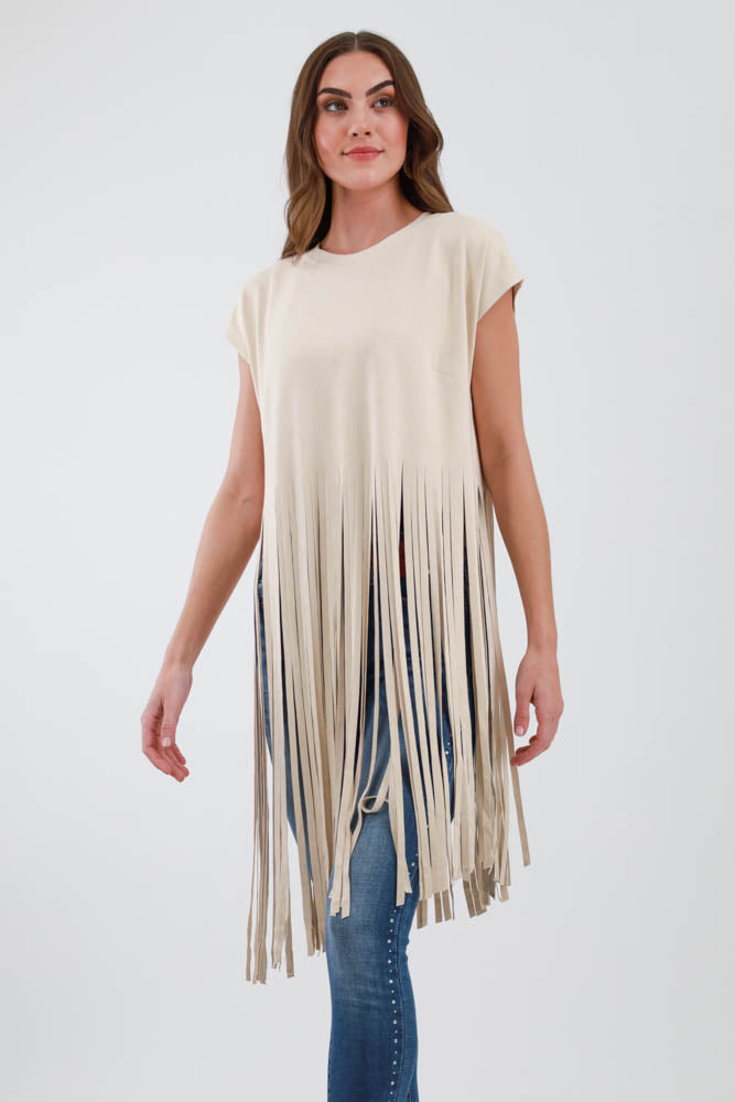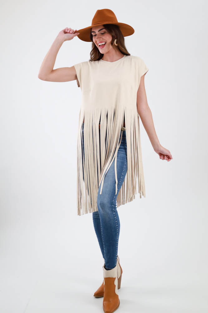 Bohemian Suede Fringe Short Sleeve Top - Natural