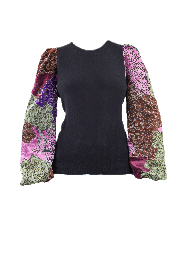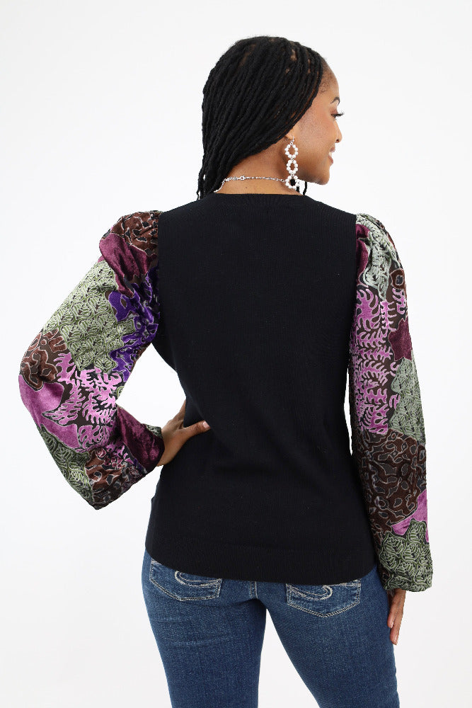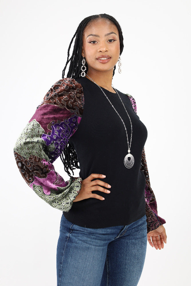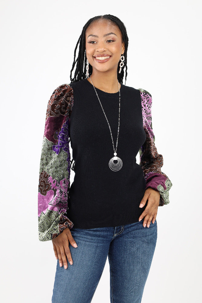 Elevate your winter wardrobe with our Contrast Burnout Velvet Sleeve Sweater. This chic and cozy knit seamlessly blends comfort with sophistication, featuring luxuriously soft velvet sleeves that add a touch of opulence. The contrasting textures create a captivating visual appeal, making it a must-have statement piece for those seeking a perfect fusion of style and warmth.